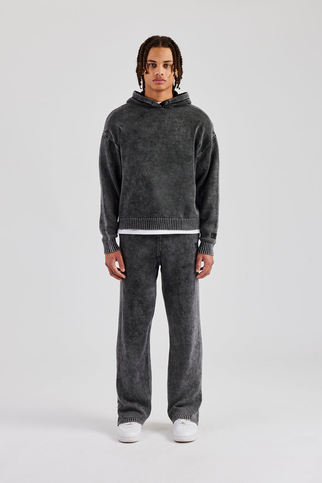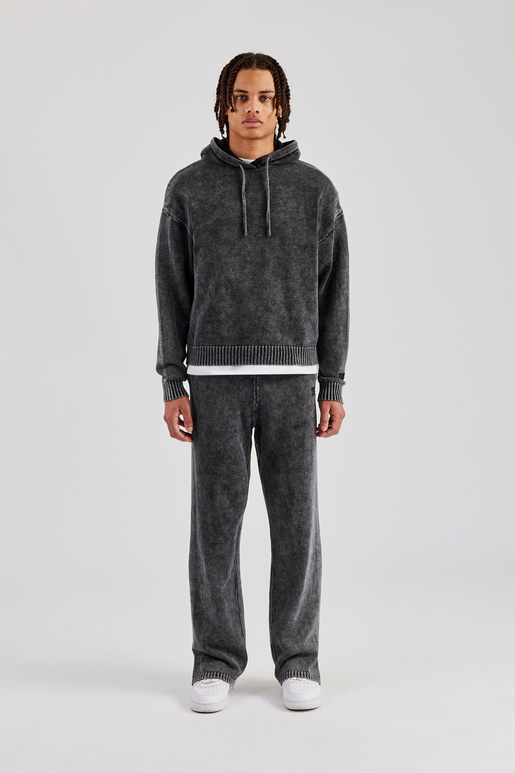 Charcoal acid wash knitted soft touch hoodie featuring tonal embroidery in a boxy fit.