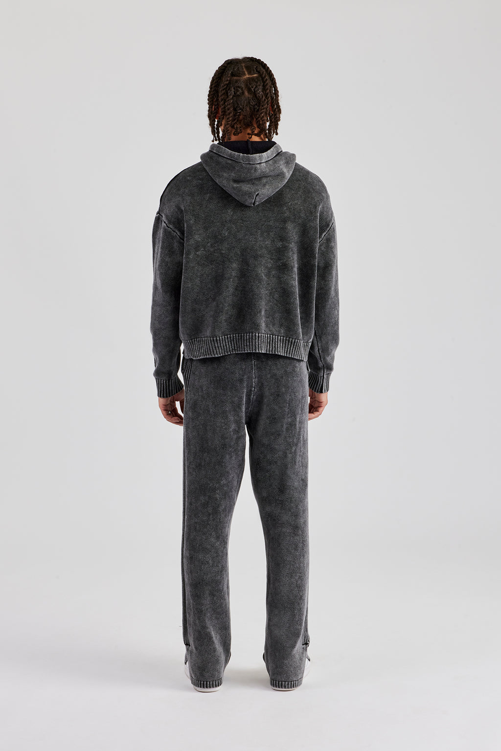 Charcoal acid wash straight leg jogger in a soft touch knit featuring tonal embroidery and a split hem.