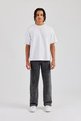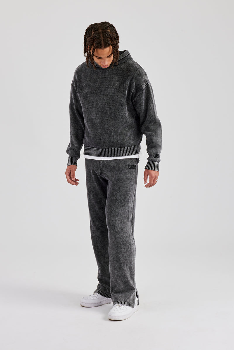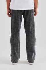Charcoal acid wash straight leg jogger in a soft touch knit featuring tonal embroidery and a split hem.