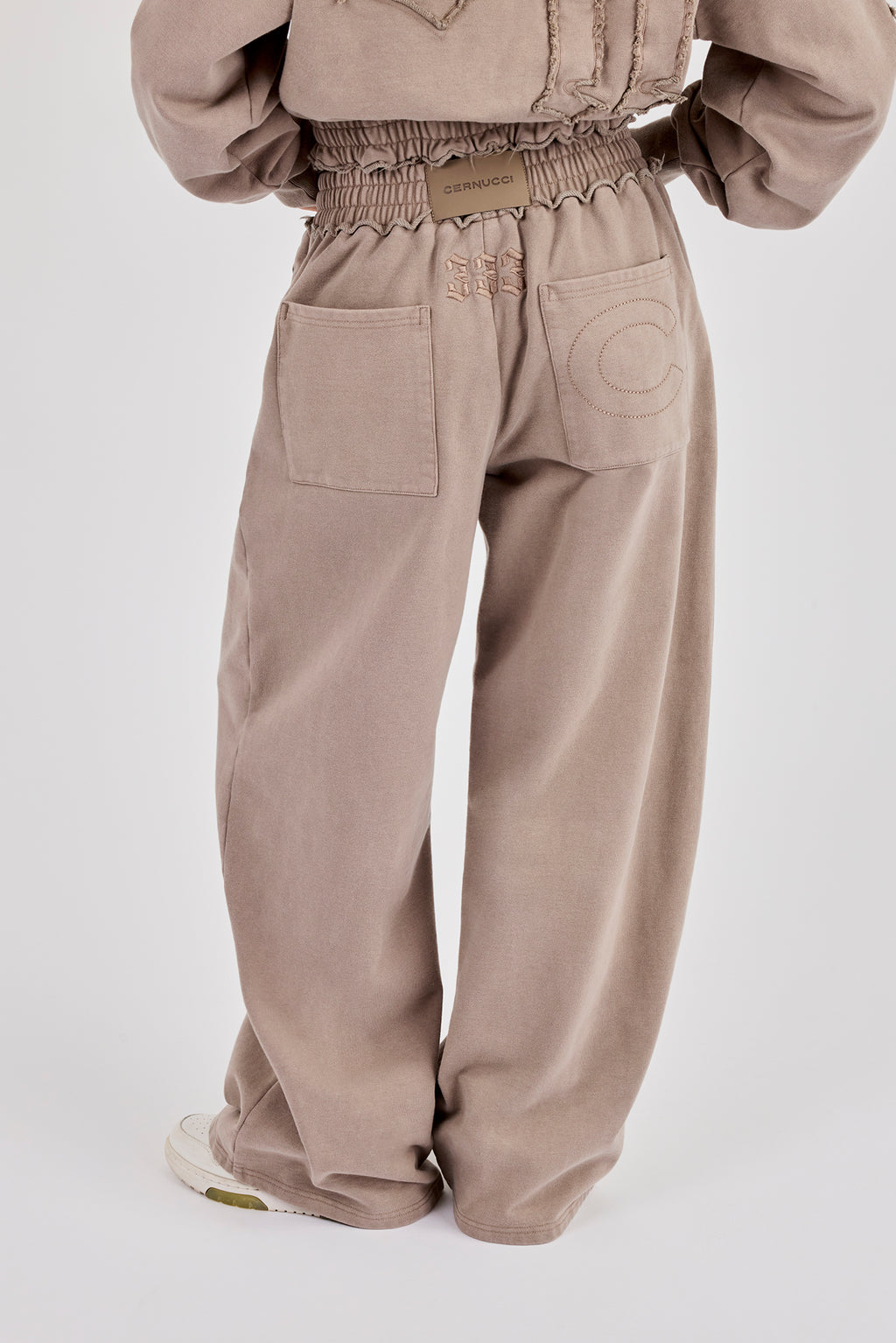Washed taupe wide leg jogger featuring applique logo. Premium soft touch jersey with Cernucci branded PU patch on centre back waistband.