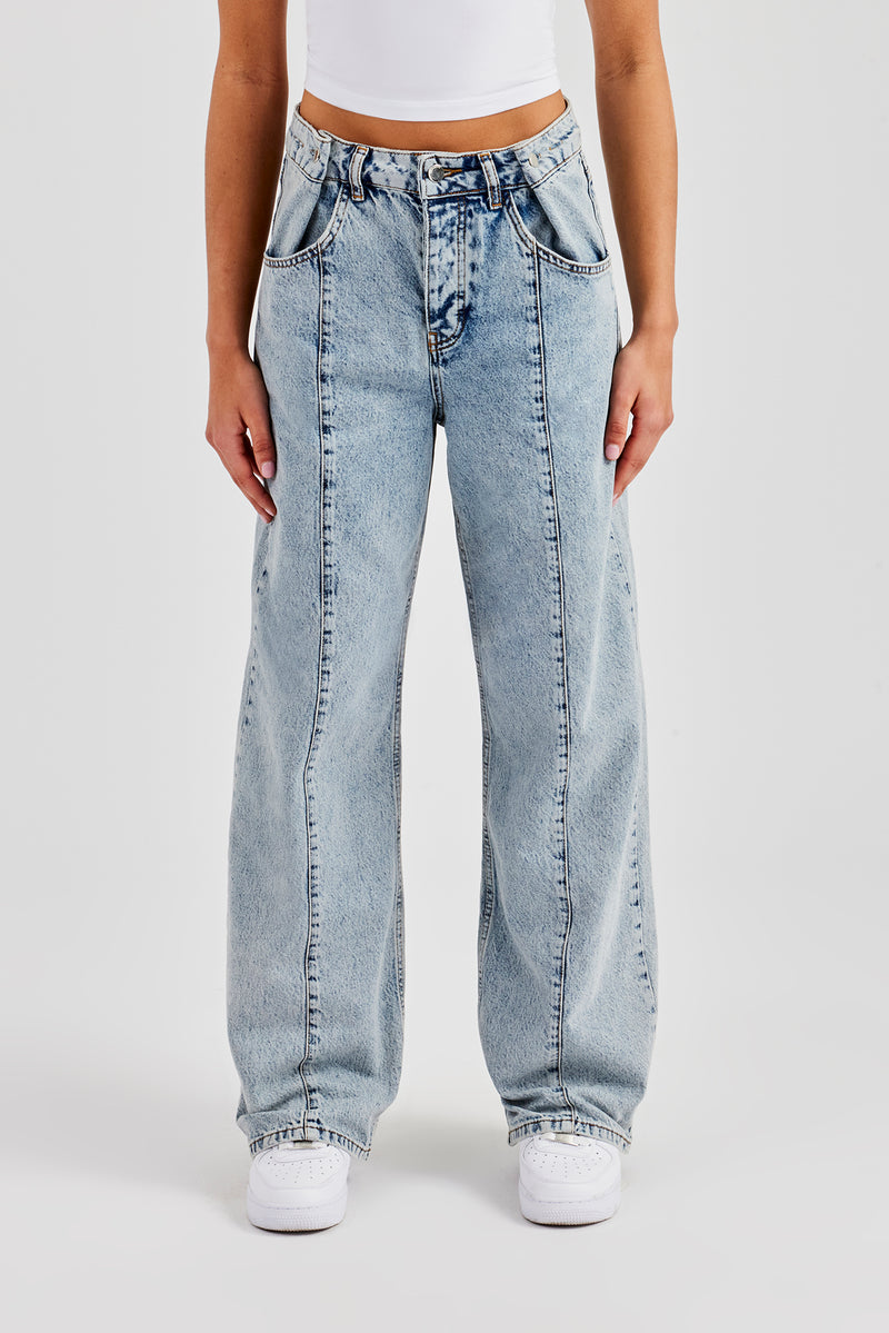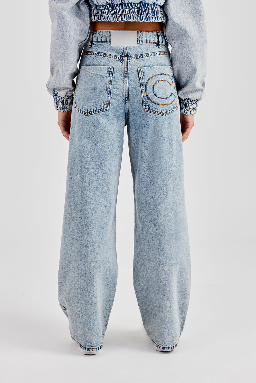 Light Vintage washed jeans, in rigid cotton denim, featuring button waist and seam detailing. Baggy fit finished with branded trims. Pair with the matching jacket for the full look.