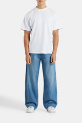 Mid blue washed jeans, in rigid cotton denim. Relaxed fit finished with branded trims.