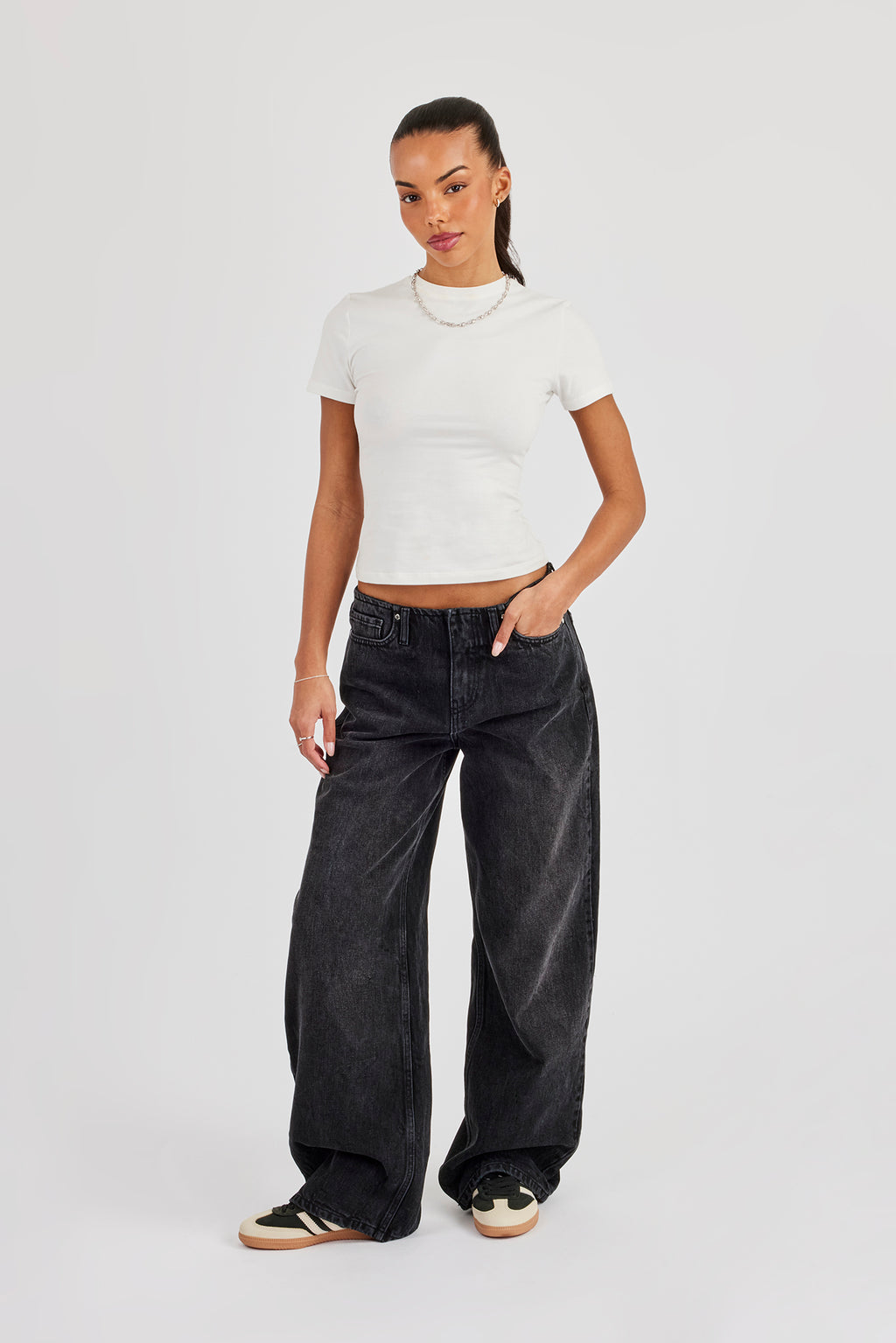 Washed black jeans in a rigid cotton denim. Our new improved low rise baggy fit.
