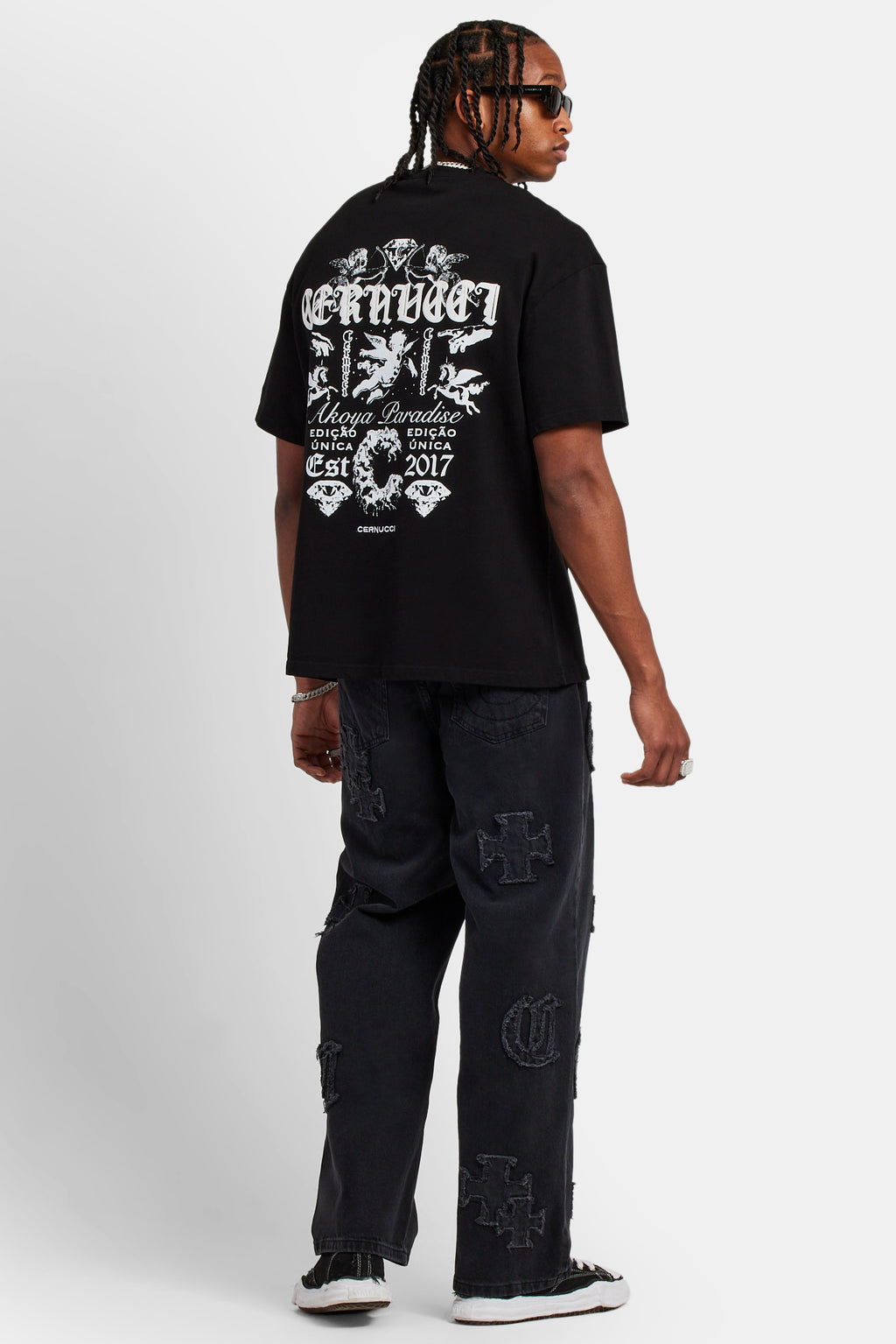 Washed black jeans in a rigid cotton denim. Baggy fit finished with raw edge applique detail.