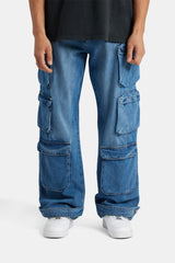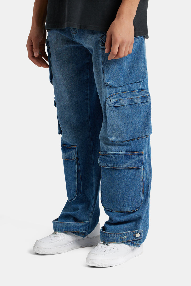 Mid blue cargo jeans, in rigid cotton denim. Baggy fit finished with branded trims.