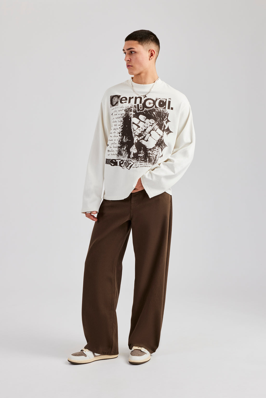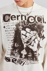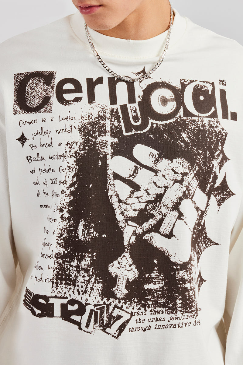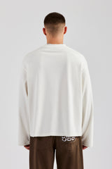 Off white long sleeve t-shirt featuring front graphic and distressed hem details. Boxy fit in a medium weight, soft touch cotton.