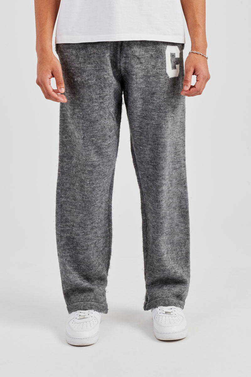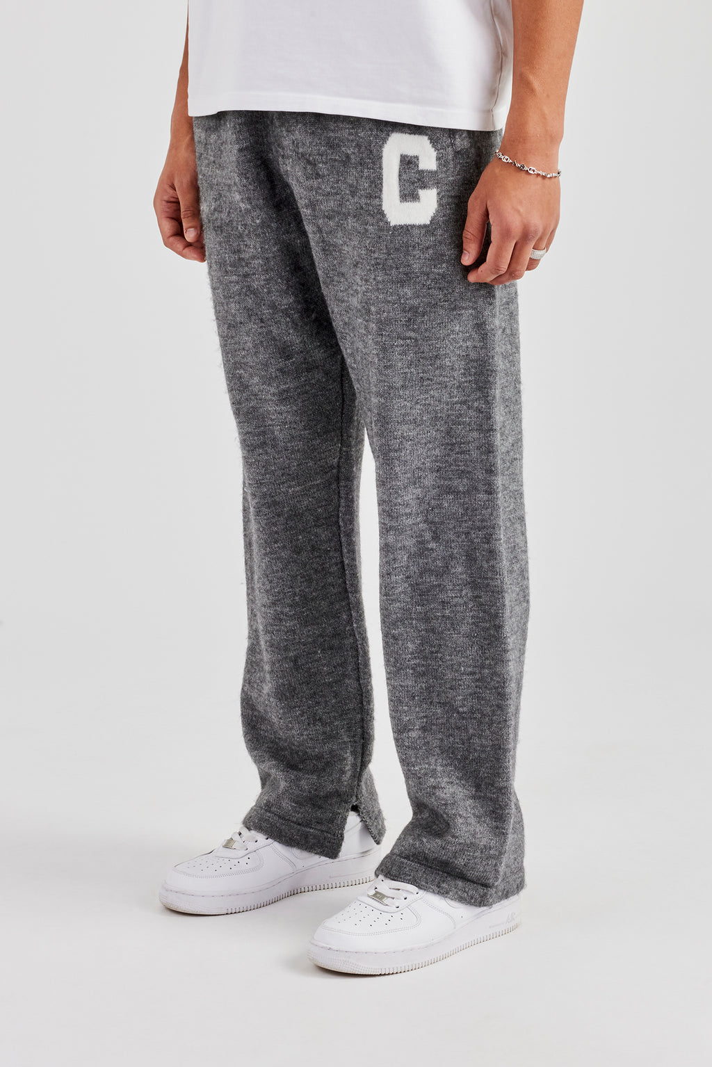 Straight leg jogger with split in a brushed knit with intarsia C.