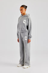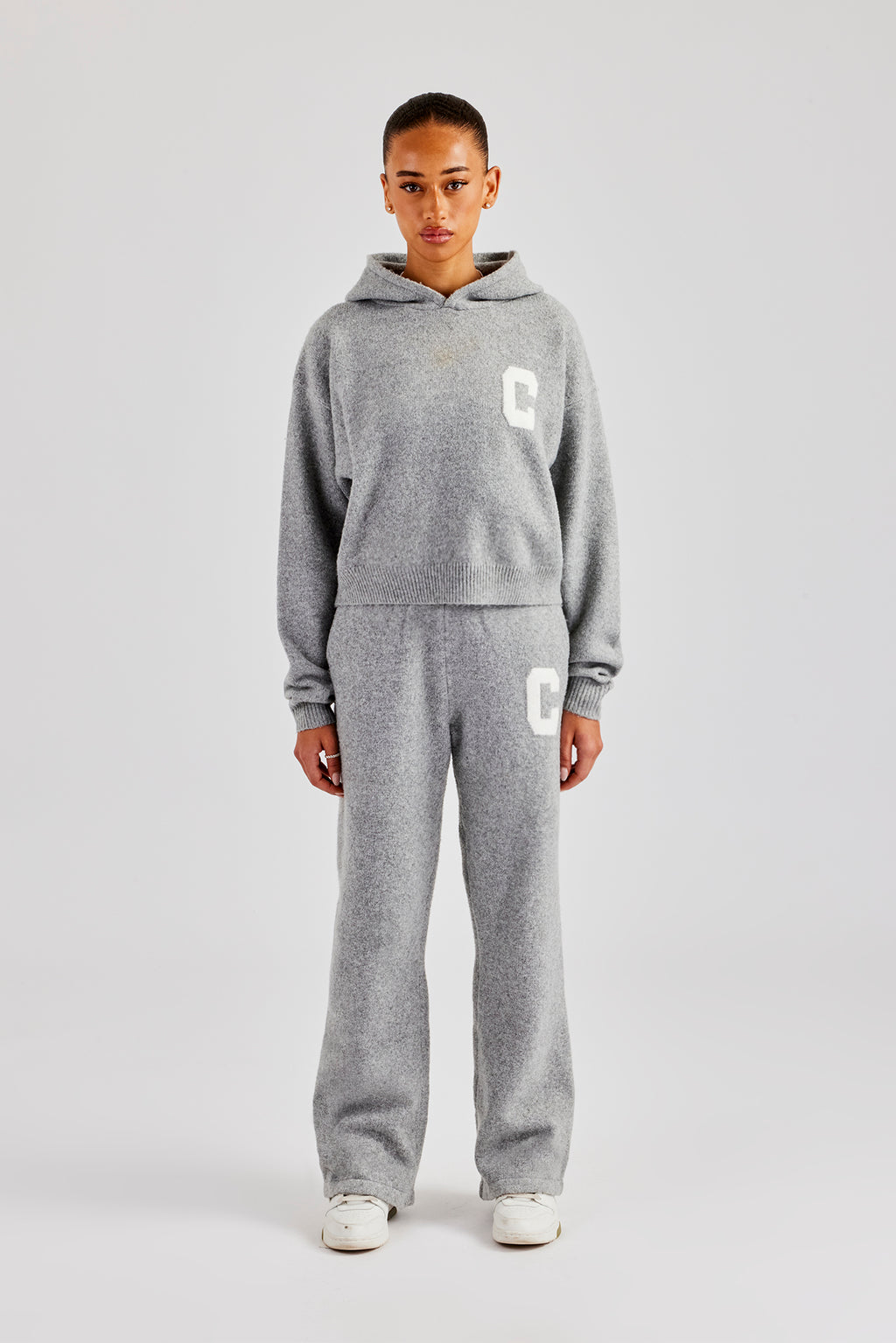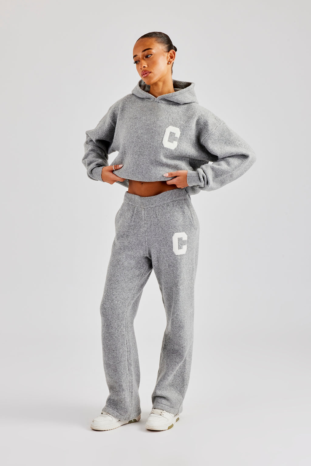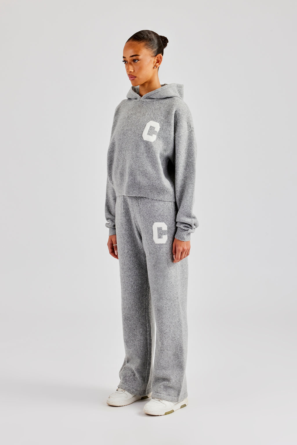 Grey wide leg jogger in a soft touch knit with jacquard C logo.