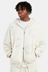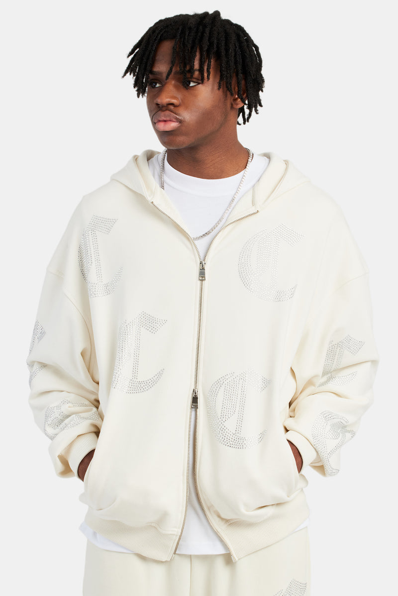 C Repeat Rhinestone Zip Through Hoodie - Ecru
