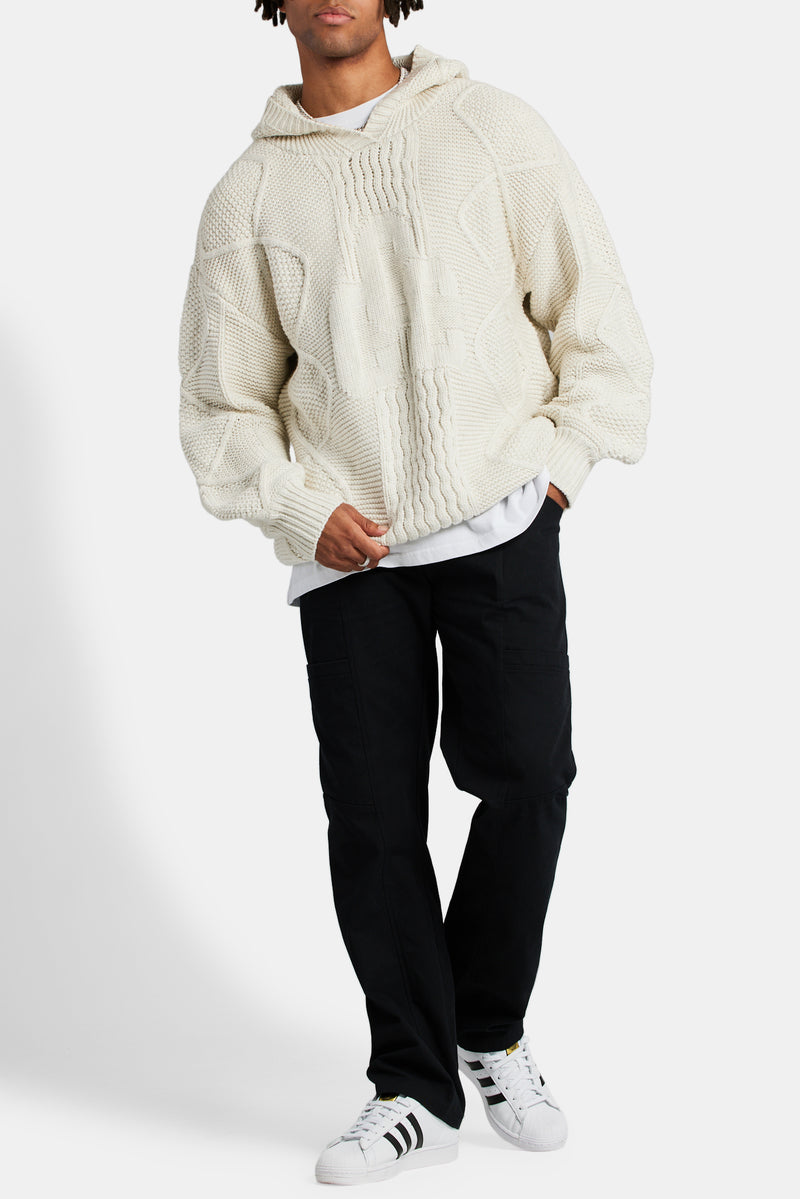 Ecru knitted hooded jumper, in a heavyweight cable knit.