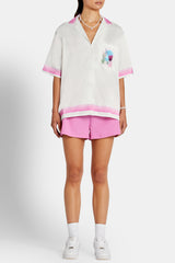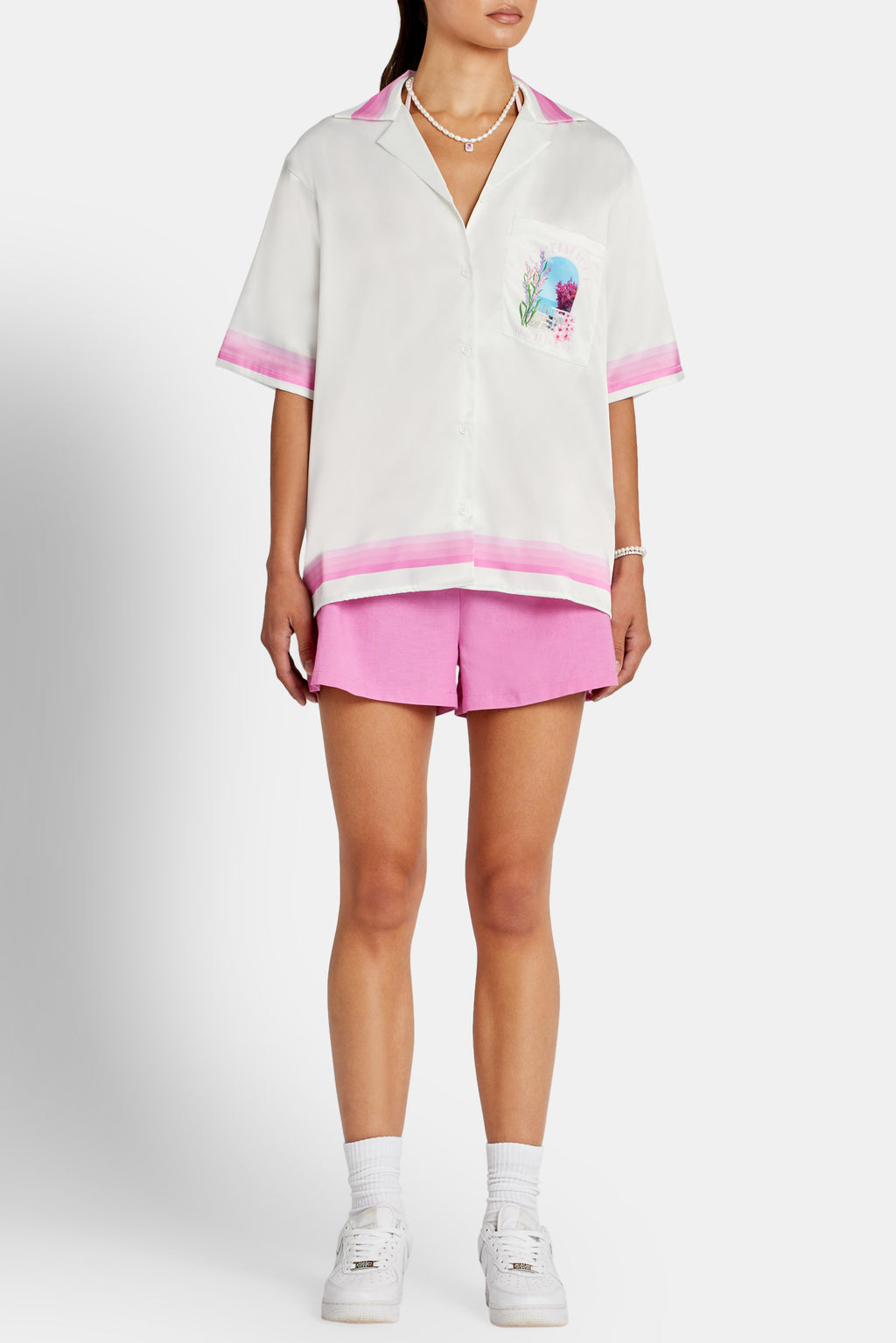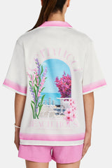 Beach house graphic short sleeve shirt with a soft satin hand feel.