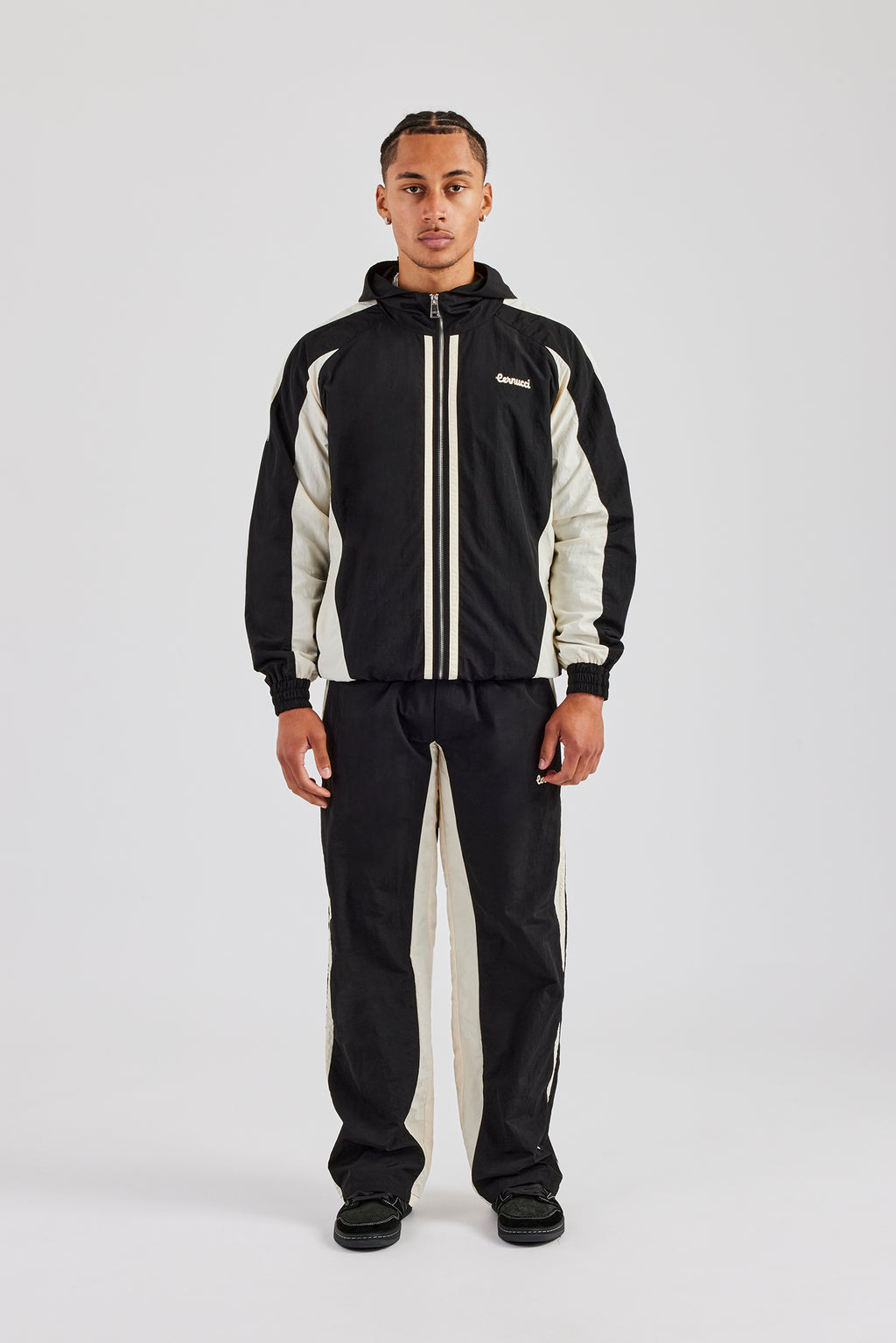Black colour block panelled track jacket in lightweight nylon, featuring contrast branding.