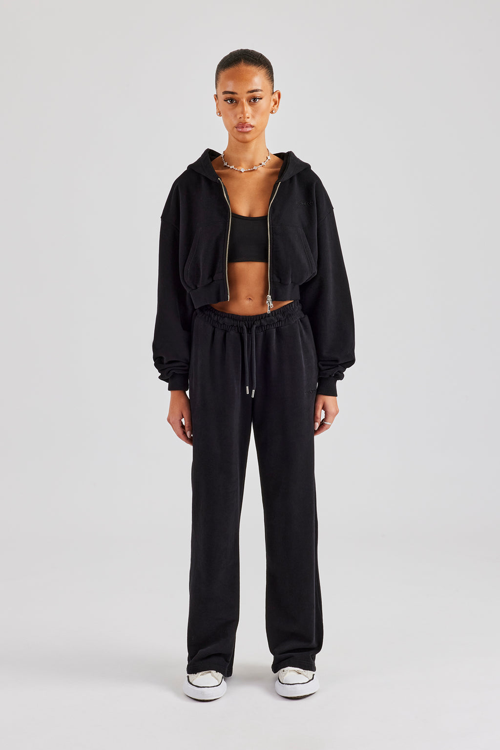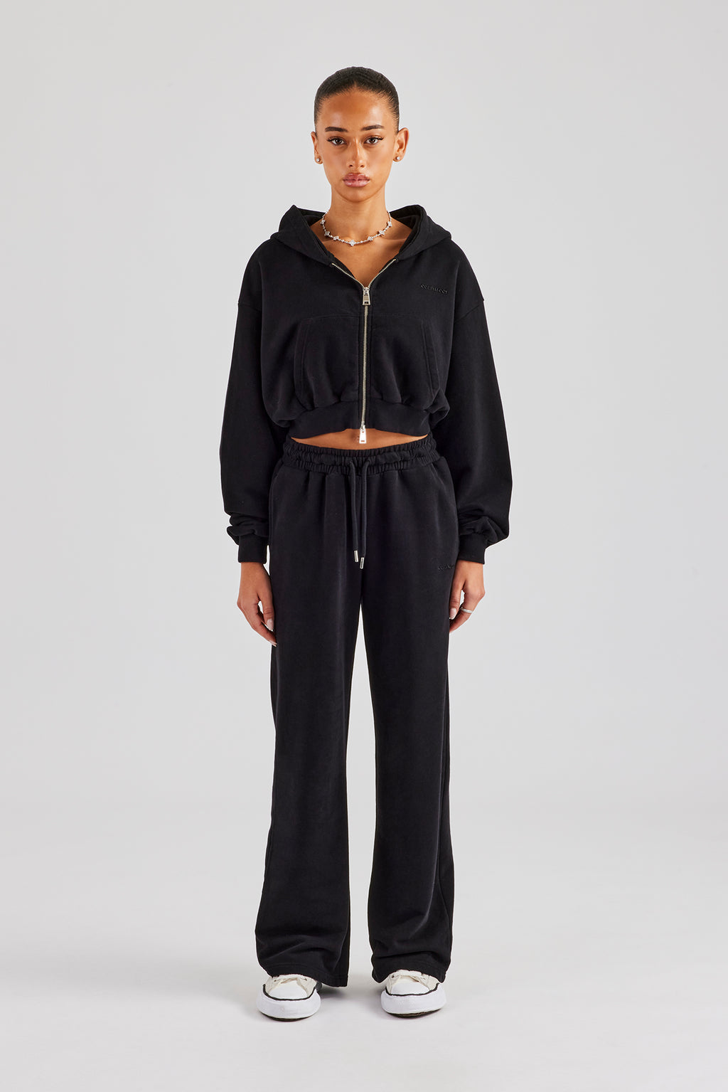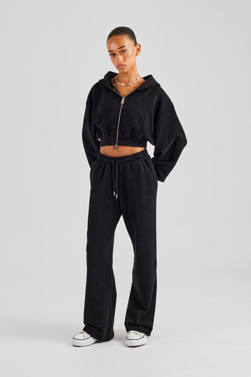 Black Wide Leg Jogger. Premium heavyweight soft touch jersey with tonal rubber tab on back pocket.