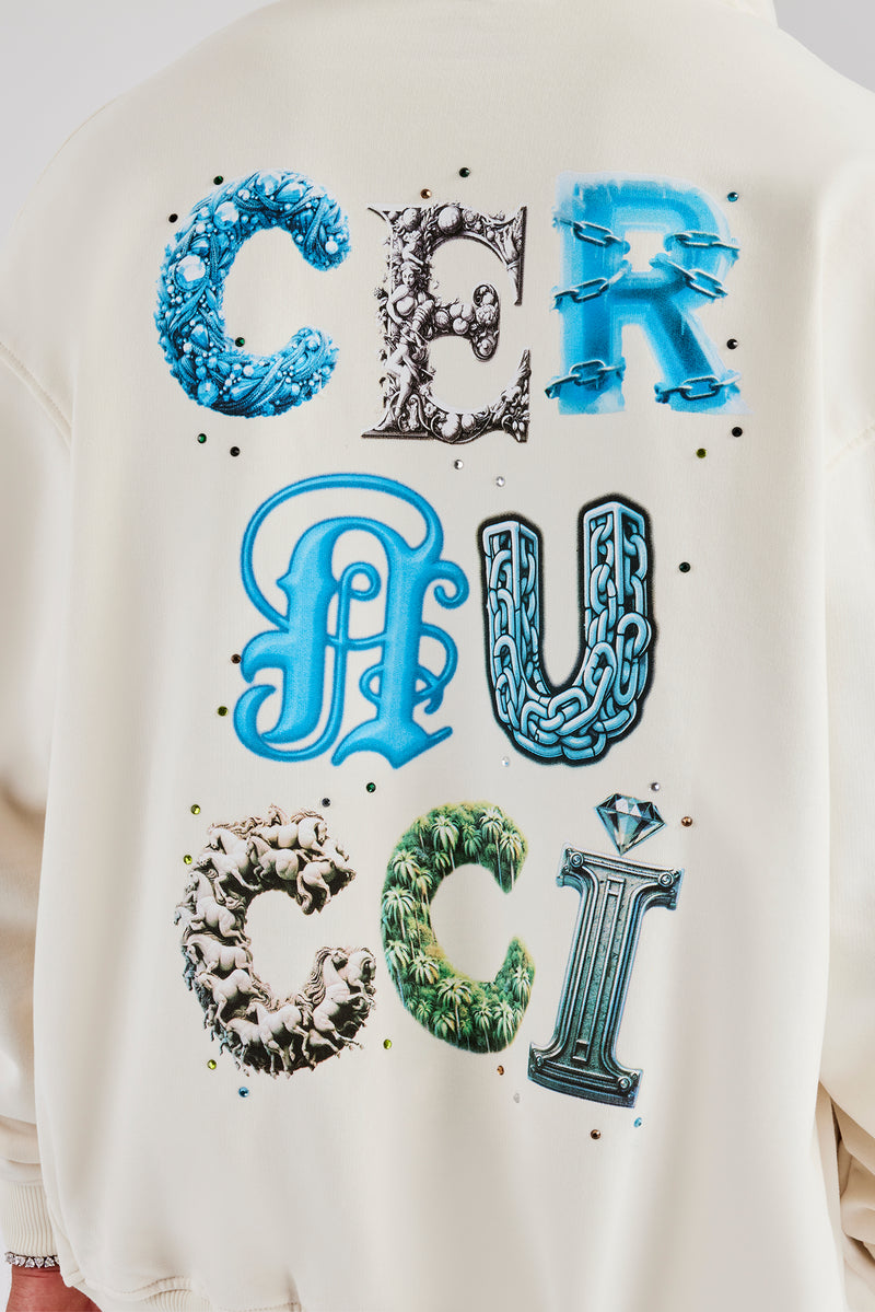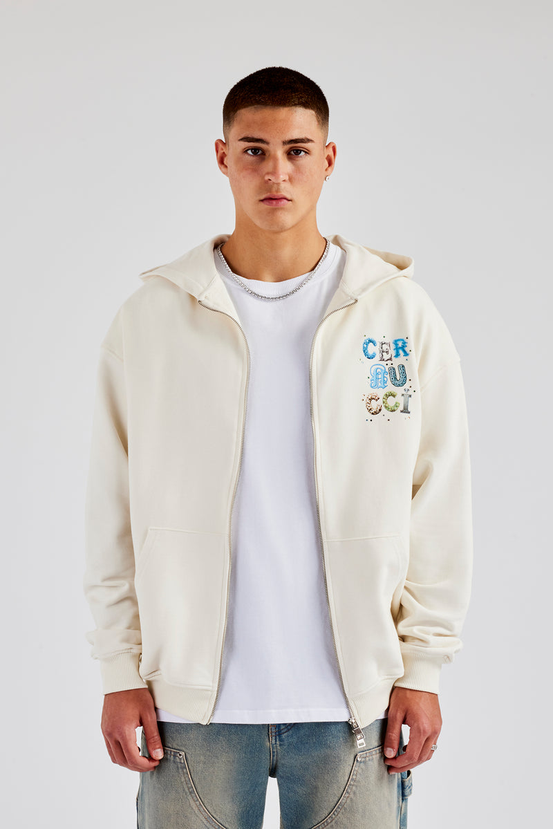 Cernucci letter rhinestone zip through hoodie. Oversized fit in a heavy weight, soft touch cotton.