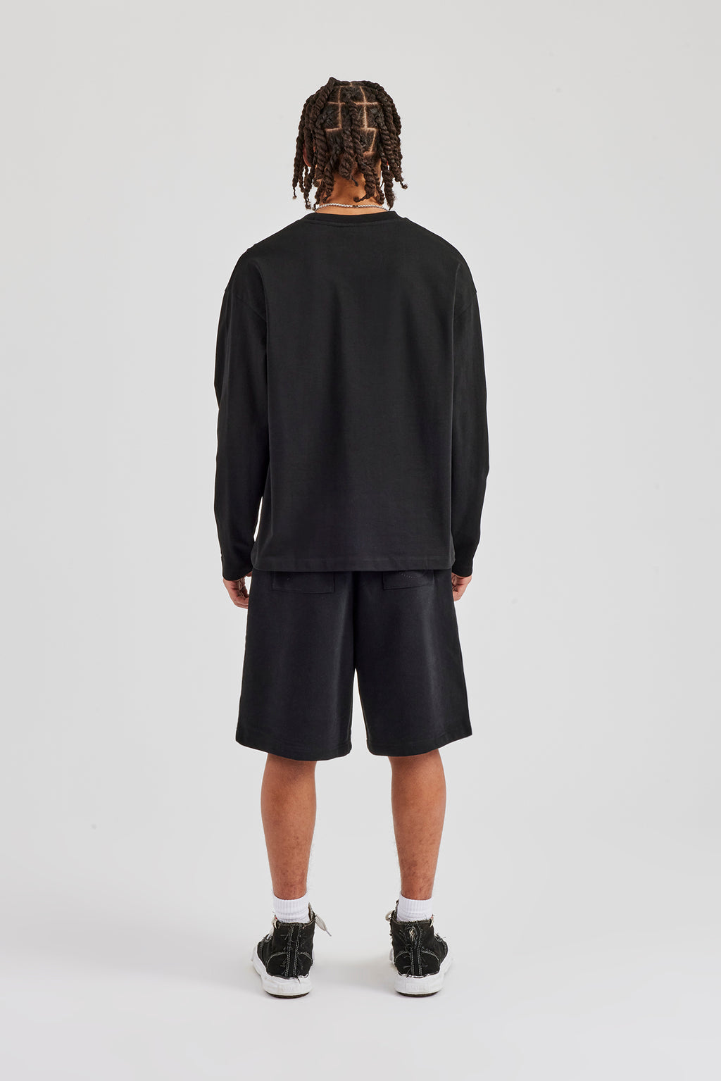 Black long sleeve t-shirt featuring tonal embroidered logo. Our improved long sleeve tees have a relaxed fit and open cuff to each sleeve, finished with a ribbed collar in a medium weight cotton jersey.