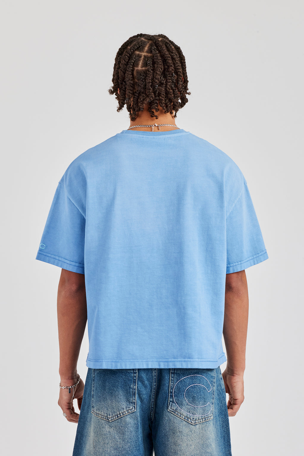 New t-shirt fits featuring our best selling oversized boxy fit, dropped shoulders and cropped body designed to sit on the waist. Blue short sleeve t-shirt featuring tonal printed logo.