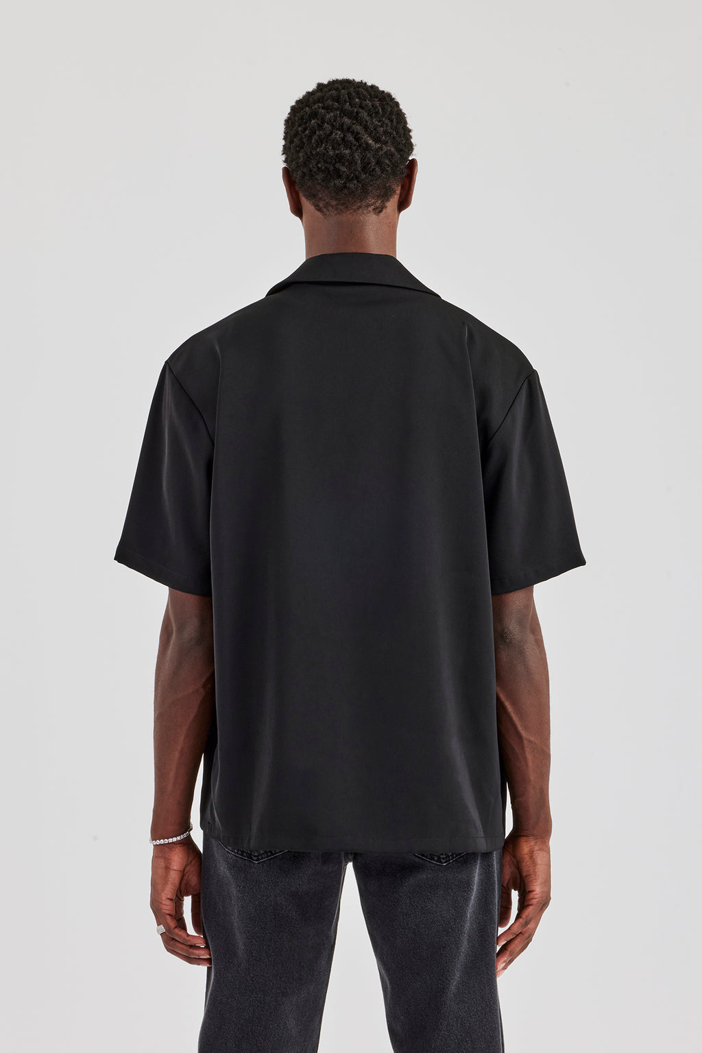 Black button front shirt with contrast script embroidery. Complete the look with our matching short