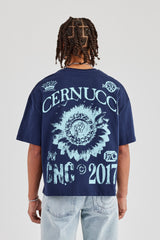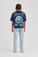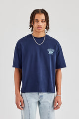 New t-shirt fits featuring our best selling oversized boxy fit, dropped shoulders and cropped body designed to sit on the waist. Navy blue short sleeve t-shirt featuring contrast printed branding