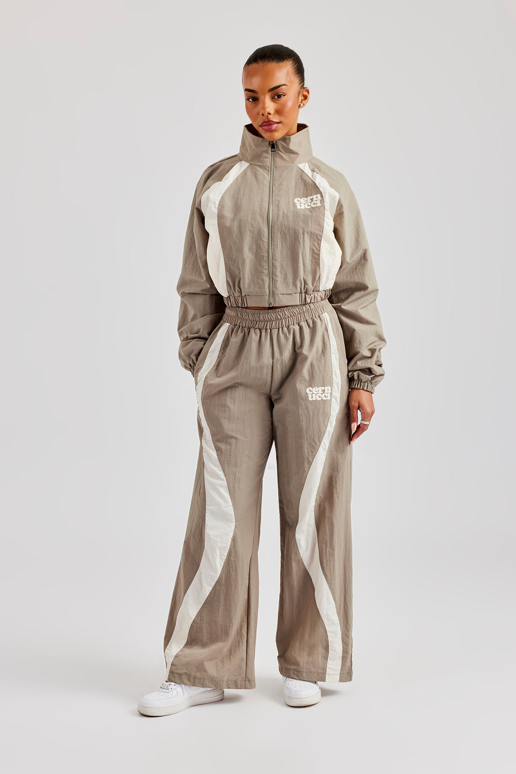 Light khaki high neck cropped nylon jacket, featuring contrast panels and an elasticated waist. Pair with the matching jogger for the full set.