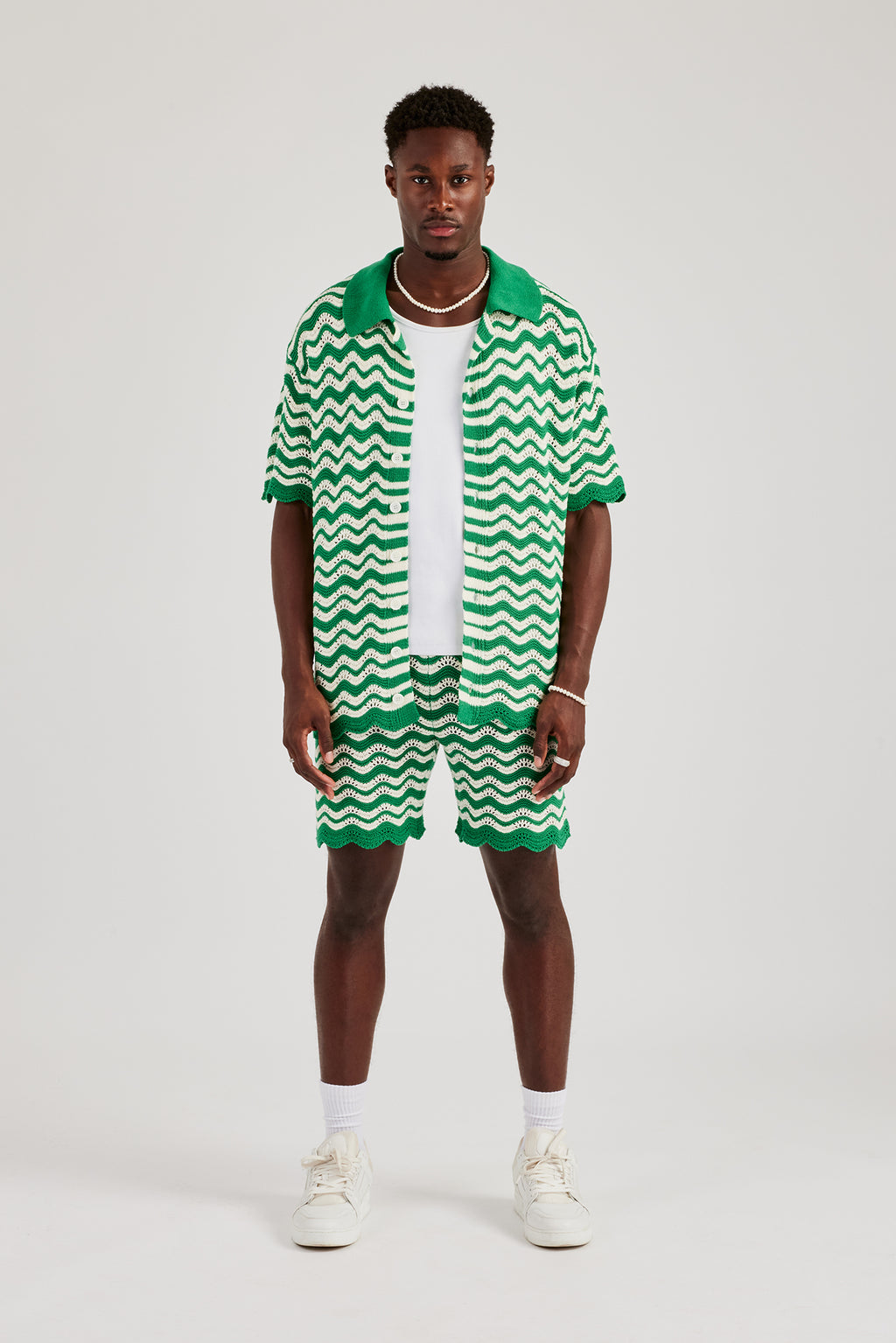 Cernucci contrast panel crochet knitted button front shirt. Pair back with the matching short to complete the look.