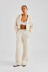 Cropped ecru zip through hoodie in a soft touch knit with contrast embroidery