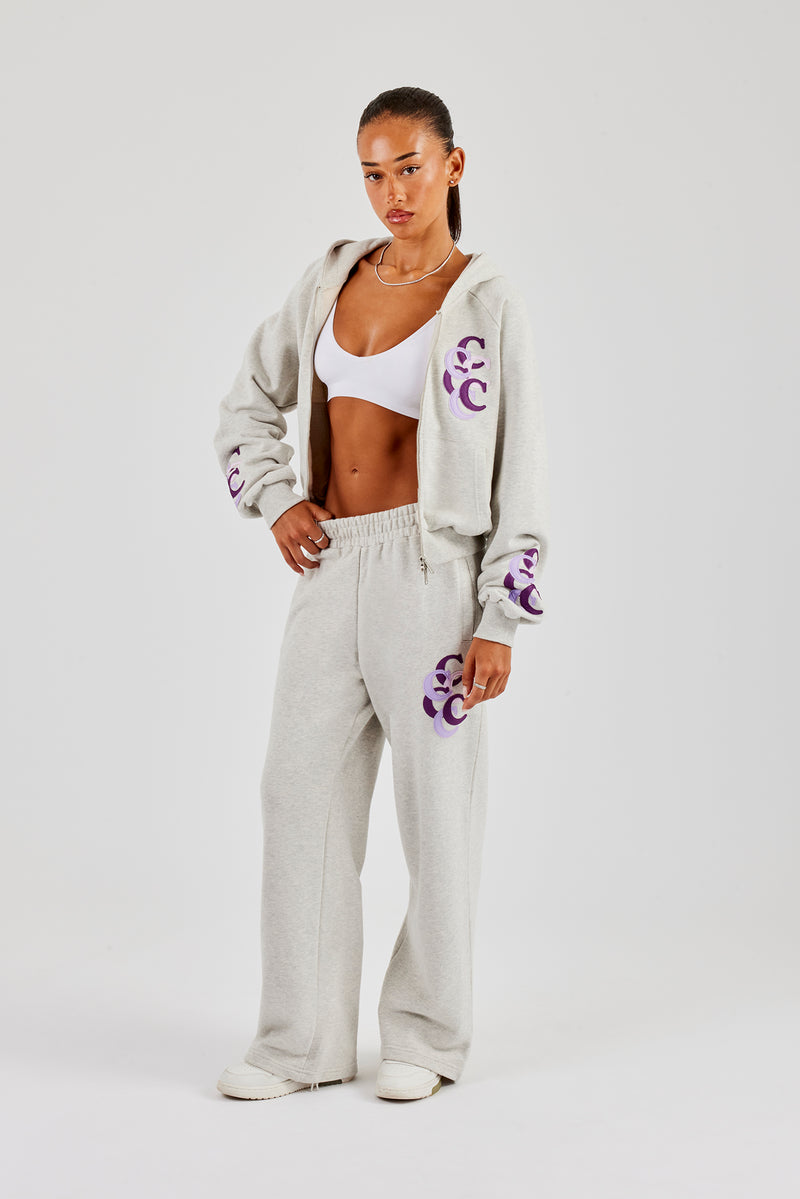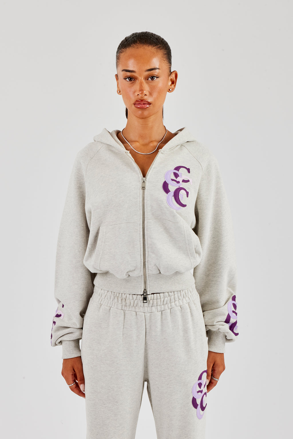 Ash grey cropped zip through hoodie, featuring layered applique branding. Premium soft touch jersey.