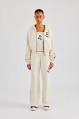 Off white Wide Leg Jogger with layered applique branding. Premium soft touch jersey with Cernucci branded PU patch on centre back waistband.