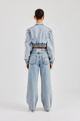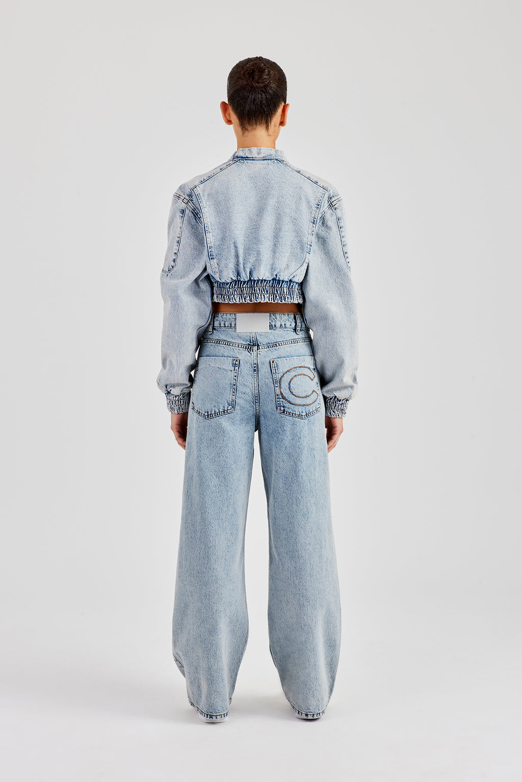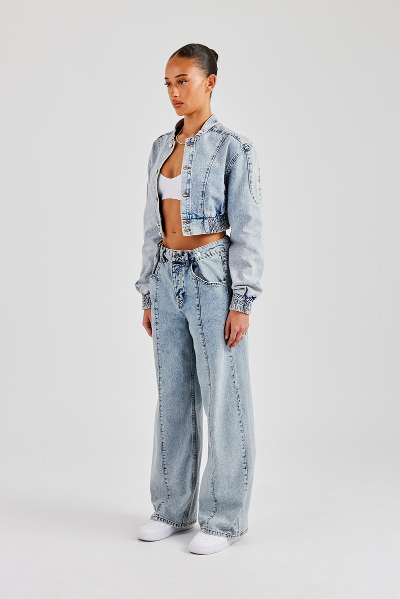 Denim bomber jacket, cropped fit with seam details in rigid cotton denim.
