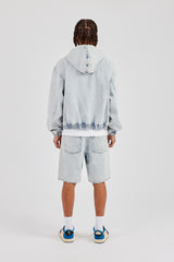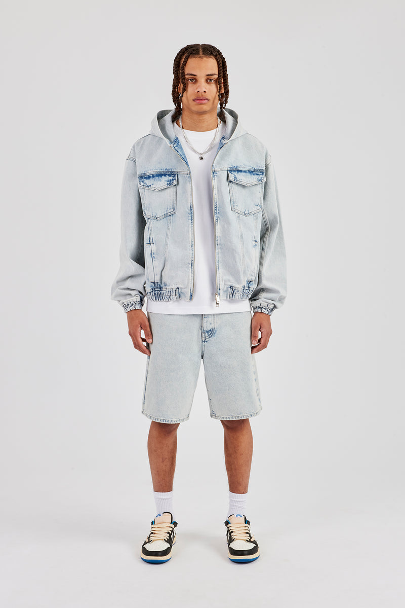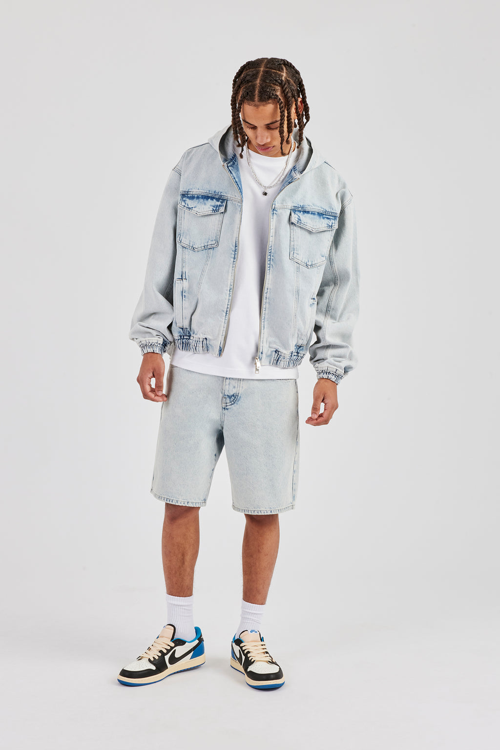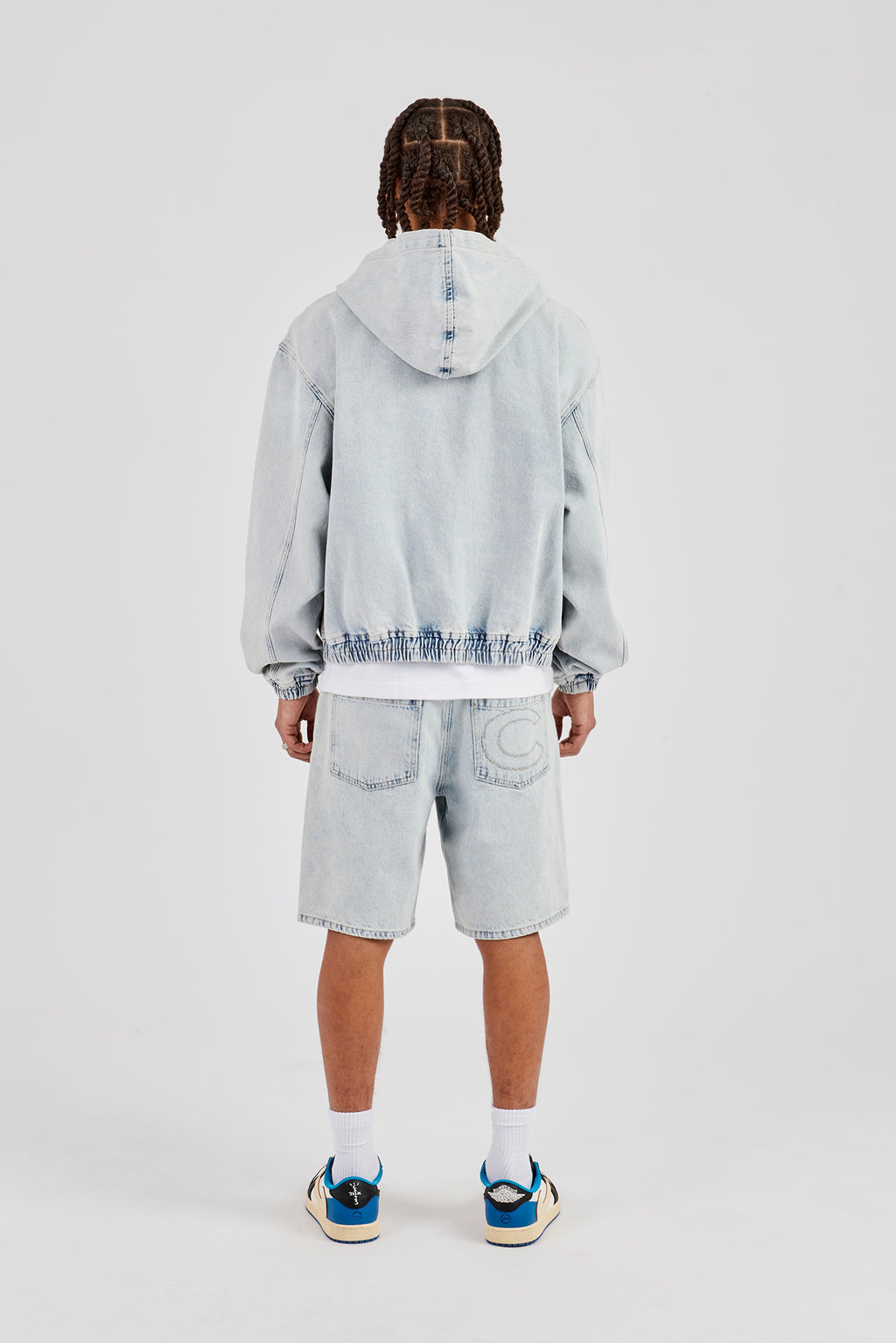 Ice blue denim hooded jacket, boxy fit, in rigid cotton denim. Finished with branded trims and pocket detailing