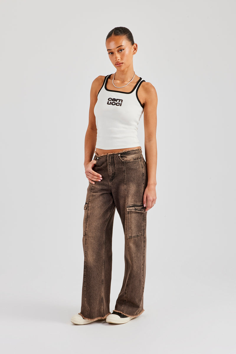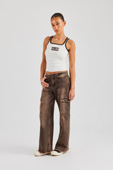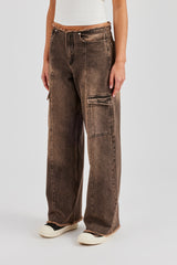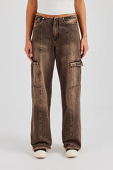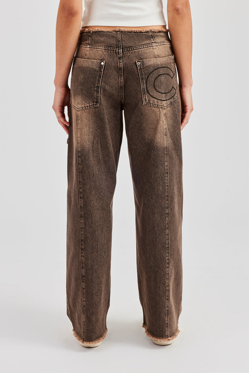 Washed brown jeans, in rigid cotton denim, featuring pockets and seam detailing. Straight leg fit finished with branded trims.