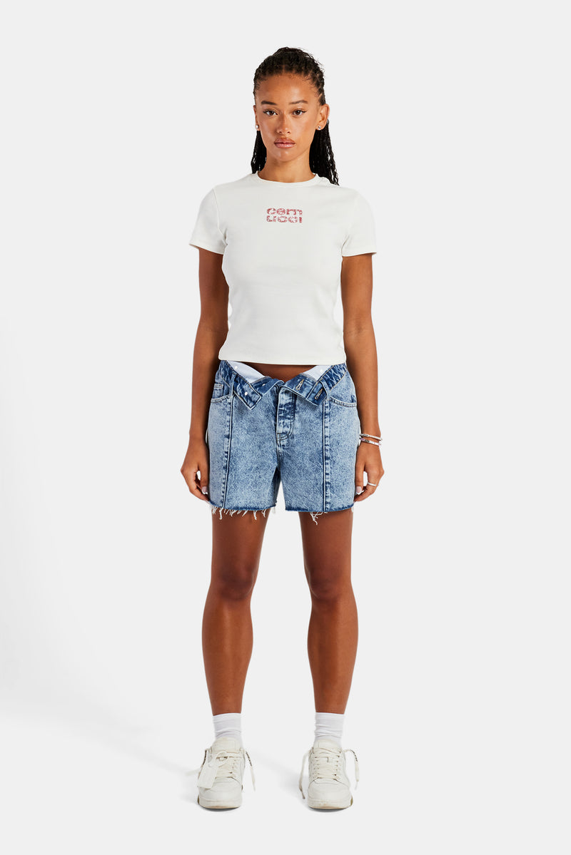 Iced blue denim short with turnover waistband, in rigid cotton denim. A summer staple, pair with our glitter applique top for the full look.