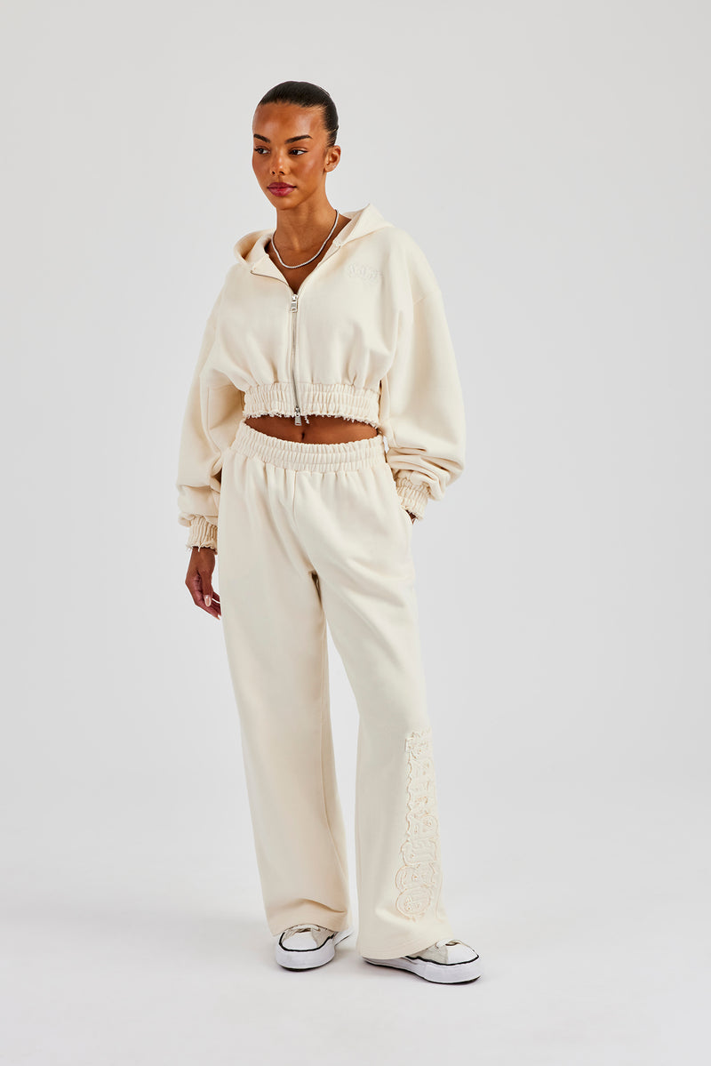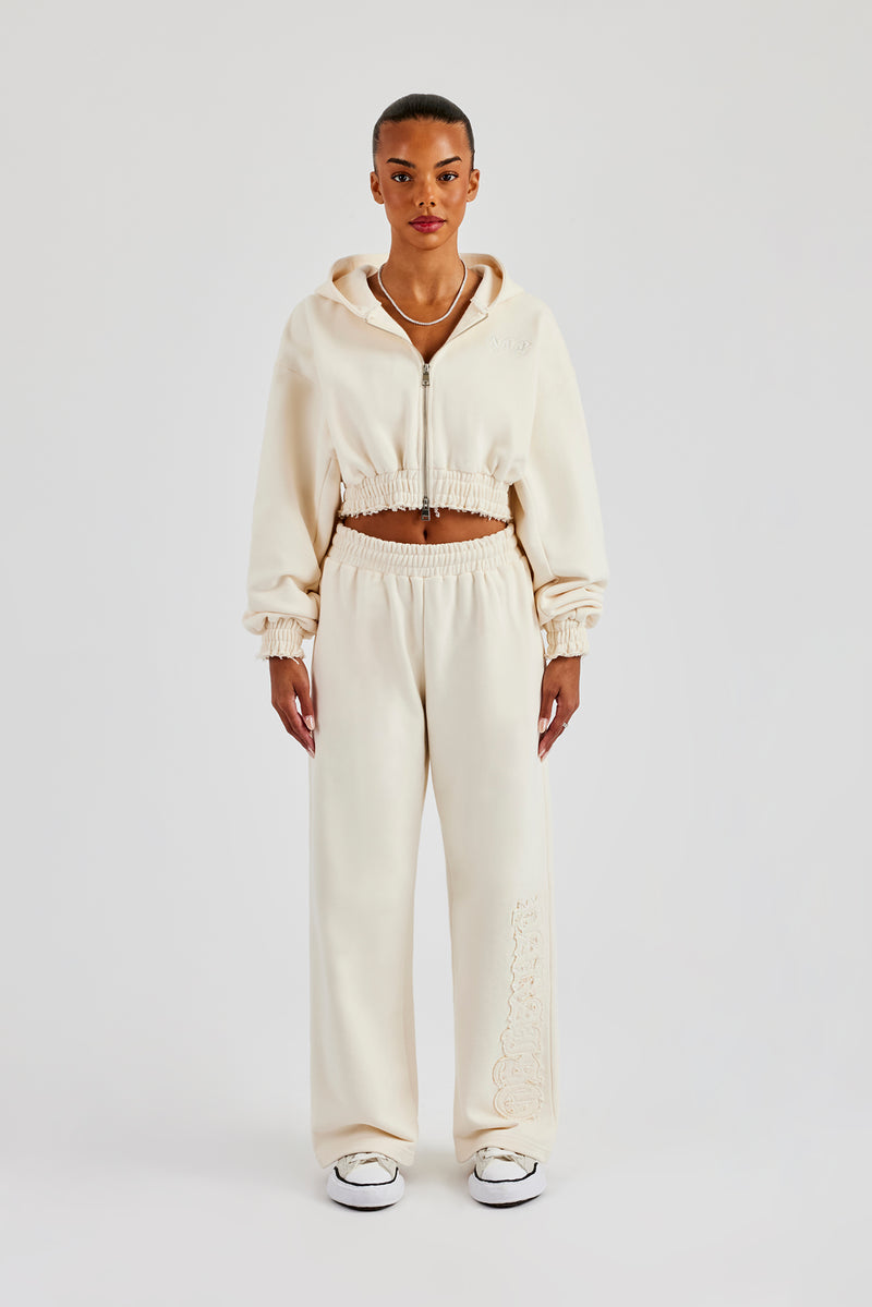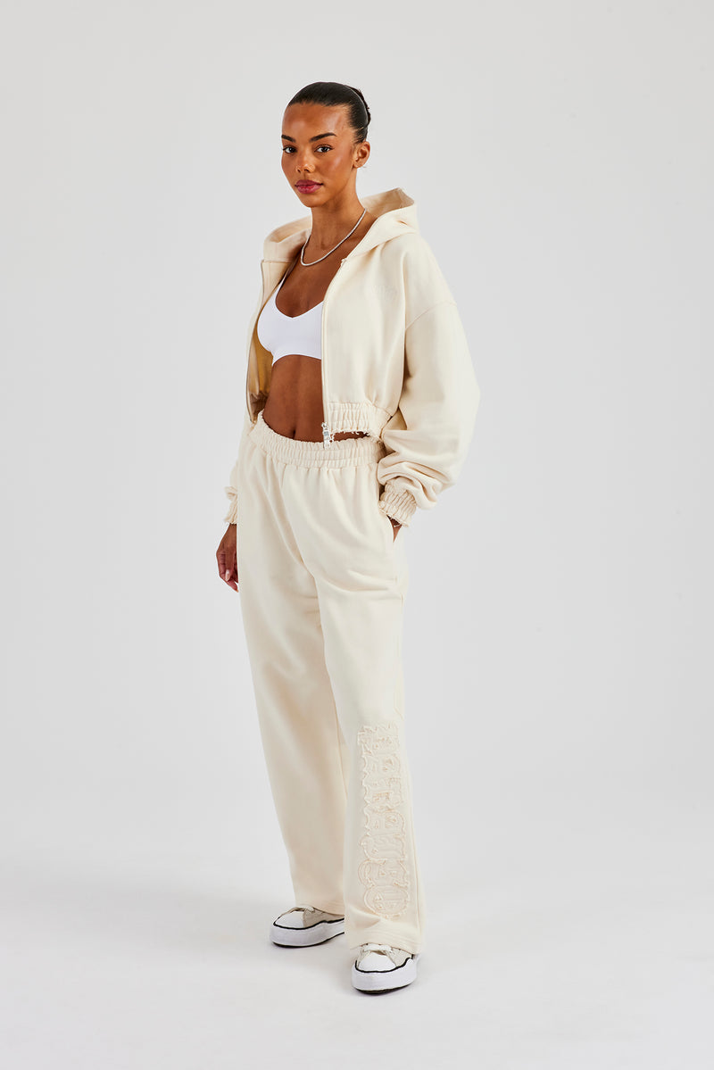 Butter yellow joggers in a wide fit finished with self fabric applique branding. Premium heavyweight soft touch jersey.