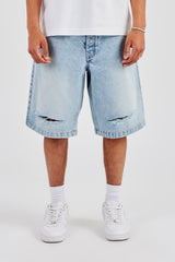 Ice blue wash distressed denim short, in rigid cotton denim.