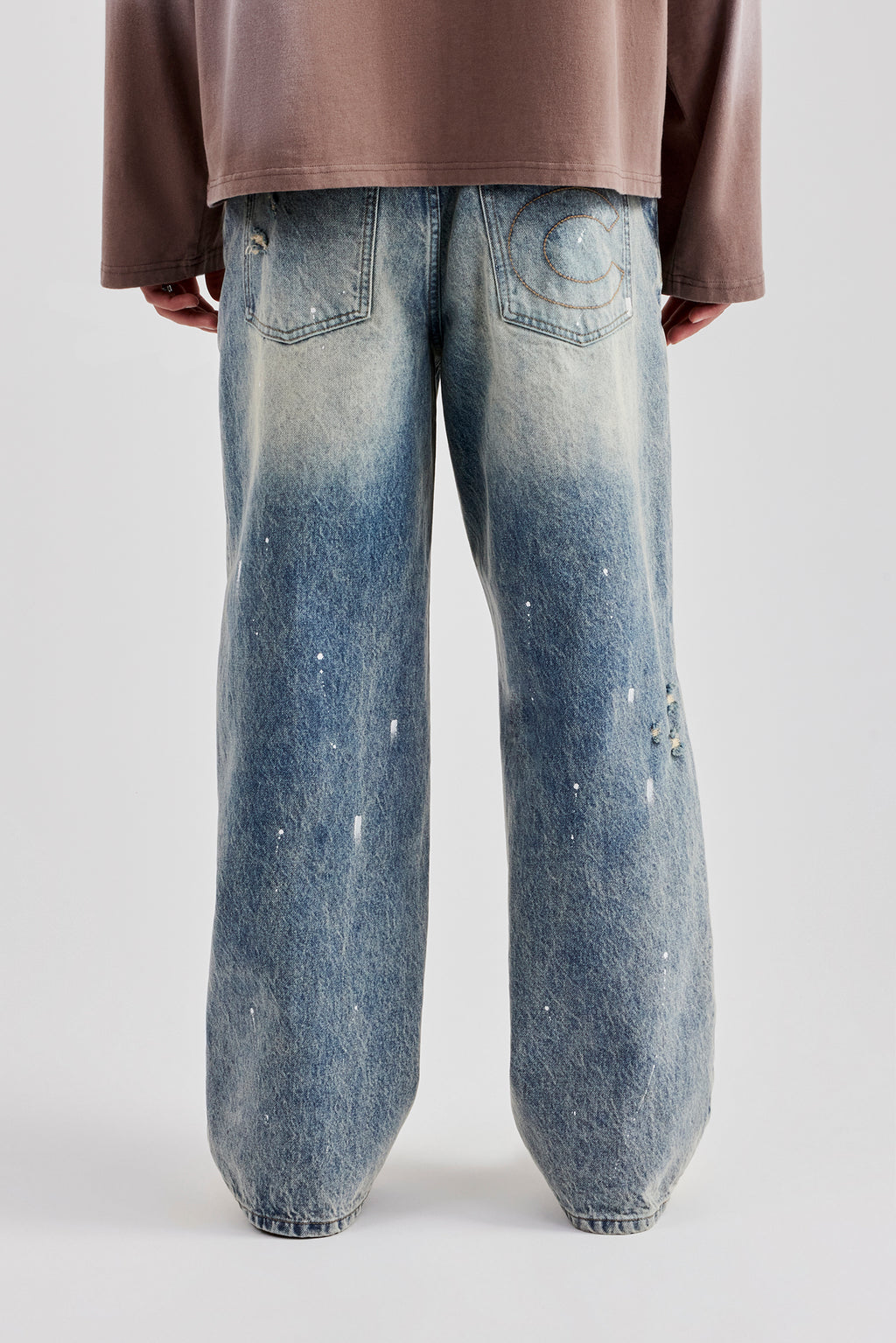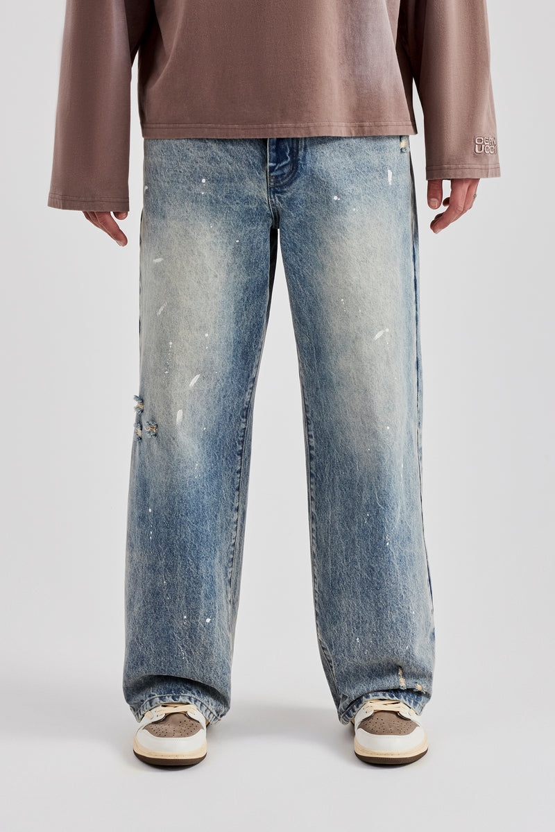 Distressed paint splatter jeans in antique wash, in rigid cotton denim. Baggy fit with, finished with branded trims.