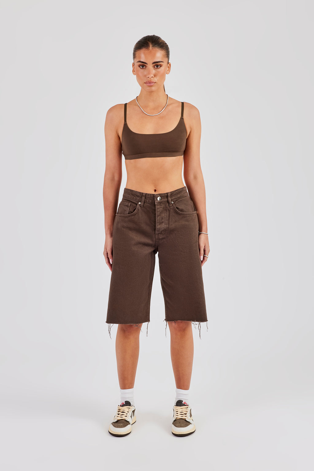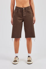 Chocolate denim jorts, in rigid cotton denim with embellished pocket detail.