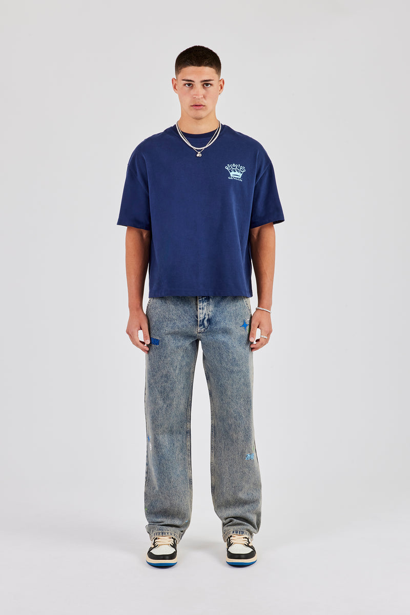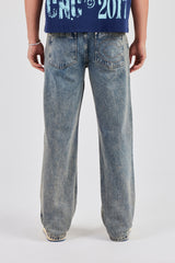 Antique wash branded jeans, in rigid cotton denim. Relaxed fit with embroidery, finished with branded trims.