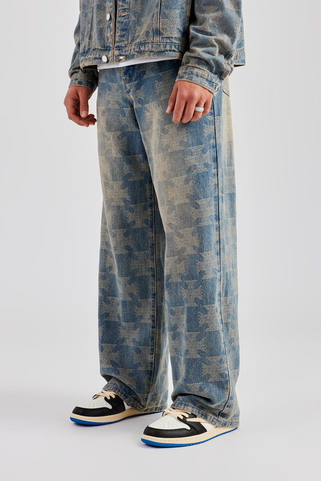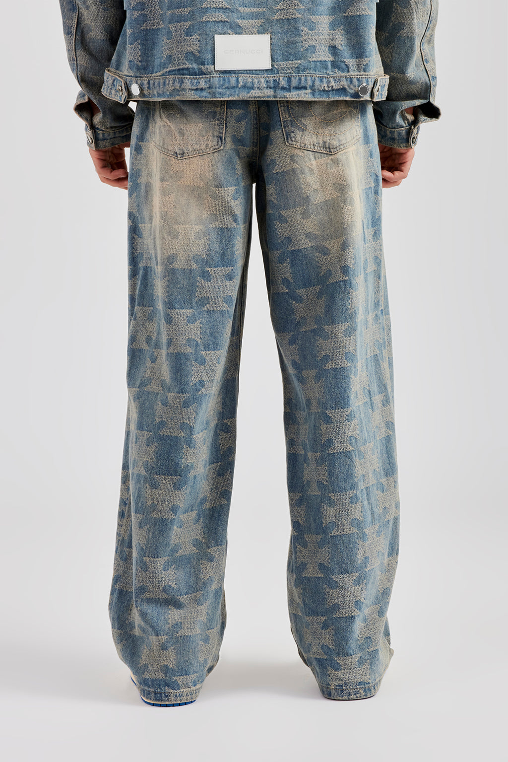 Antique wash jeans, in rigid cotton denim, featuring all over etched details. Baggy fit finished with branded trims. Pair with the matching jacket for the full look.
