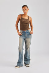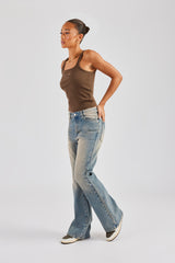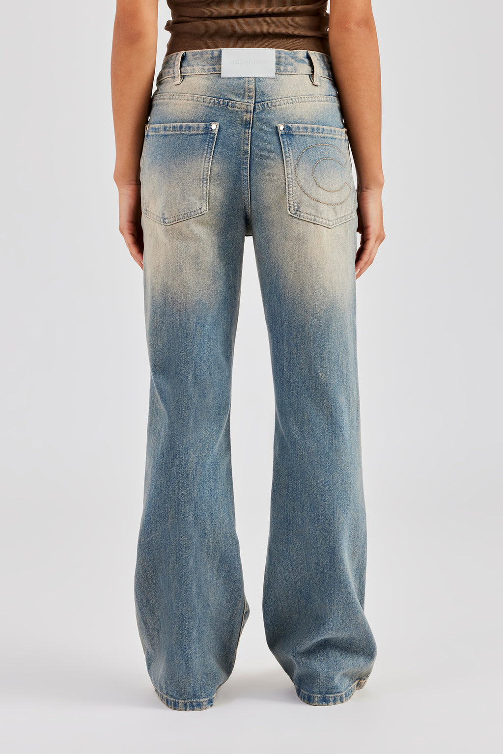 Our new antique wash flare fit jean, in rigid cotton denim.