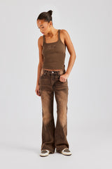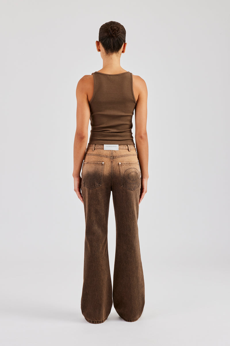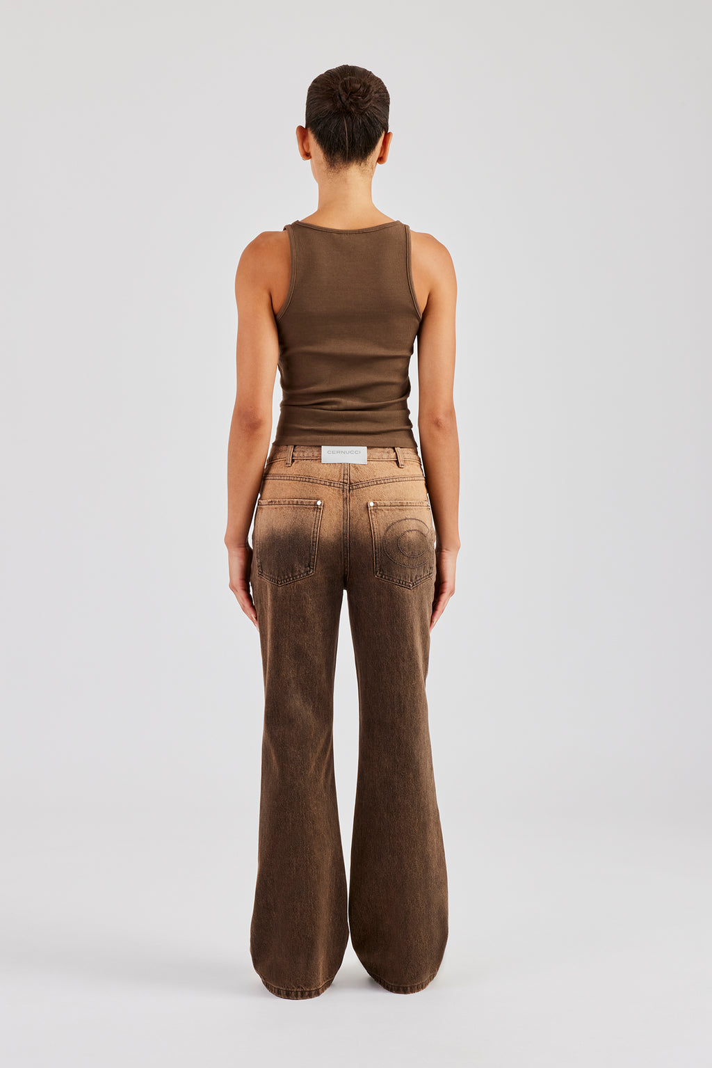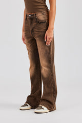 Our new washed brown flare fit jean, in rigid cotton denim.