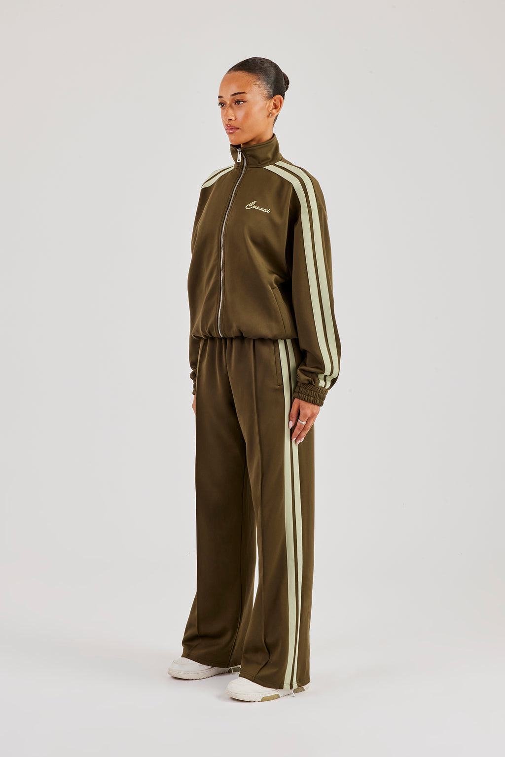 Khaki taping wide leg track pant with elasticated waistband in a soft scuba with contrast panel and tonal branding.