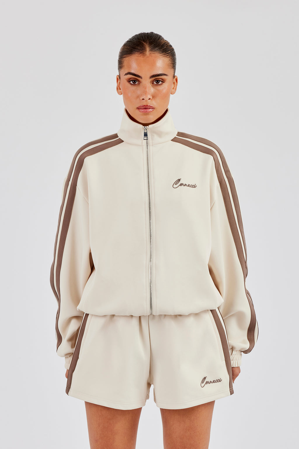 Off white zip through taping track jacket in a soft scuba, featuring a contrast side panel.