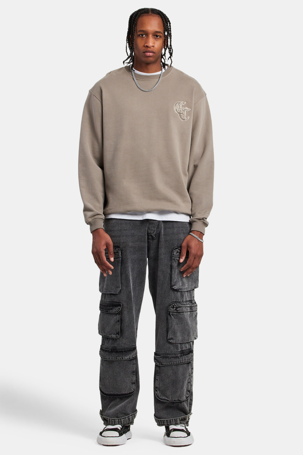 Brown washed sweatshirt with tonal rhinestone C. Premium heavyweight soft touch jersey.