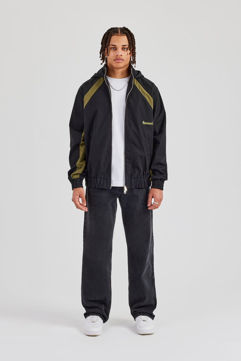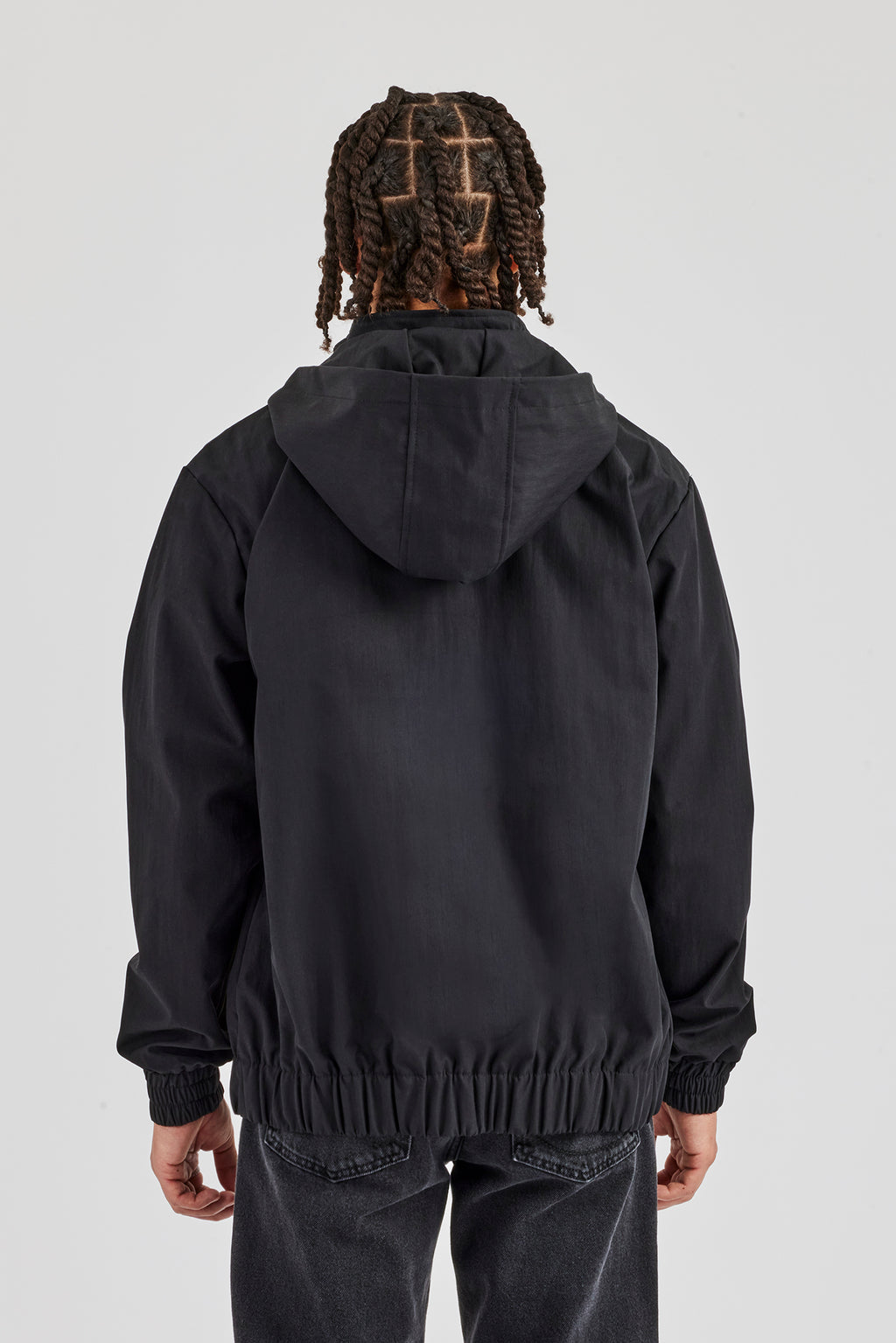 Hooded nylon jacket with contrast stripe detailing in a lightweight nylon.