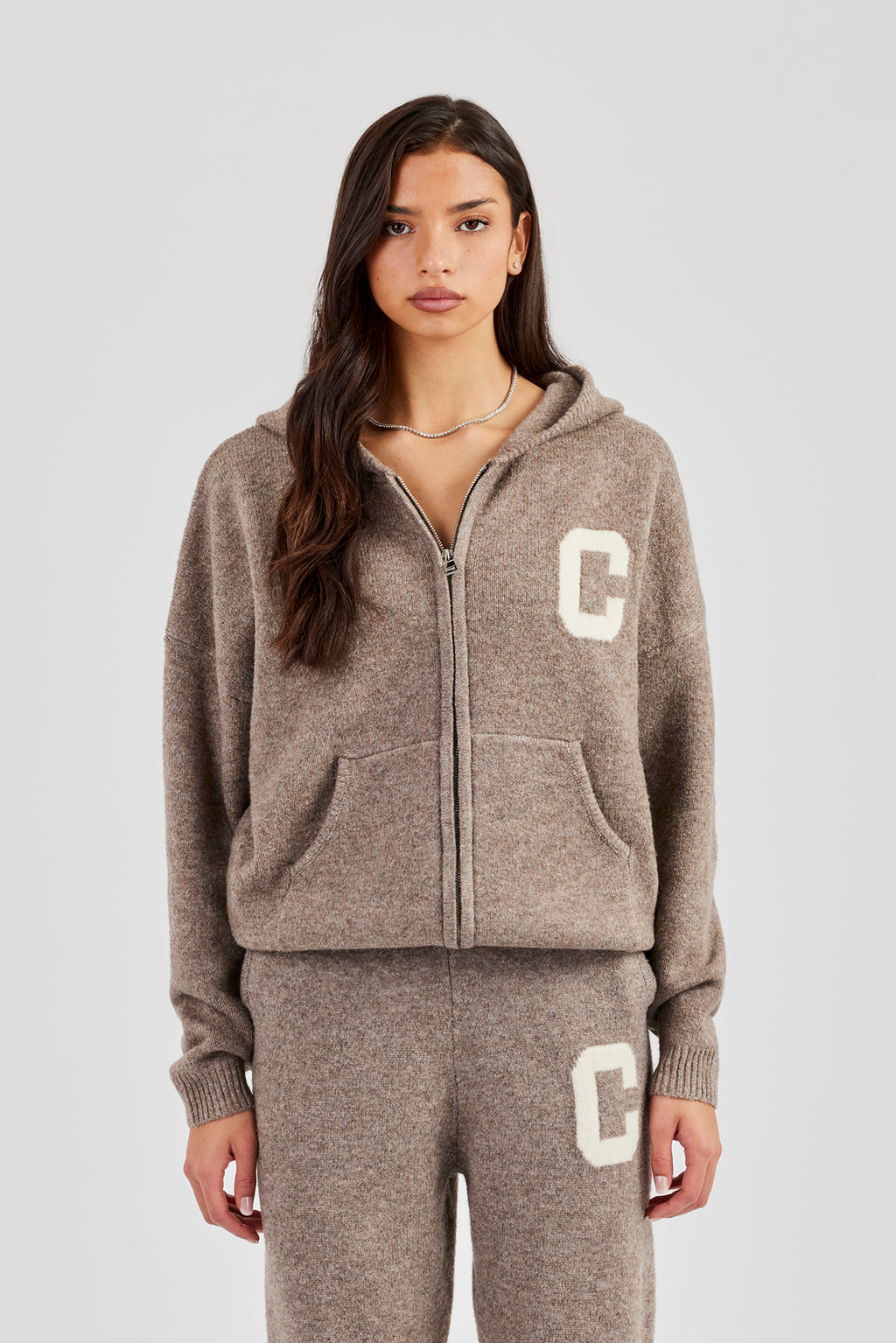 Taupe Zip Through Hoodie in a soft touch knit with jacquard C logo. Pair with matching joggers to complete the look.
