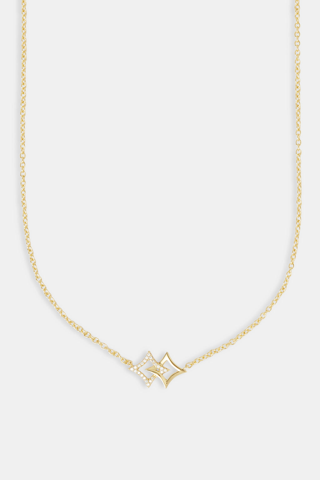 Our Iced Double Star Motif Charm Necklace goes hard. Pair your chain with a bracelet to complete the look. Turn heads on the low.