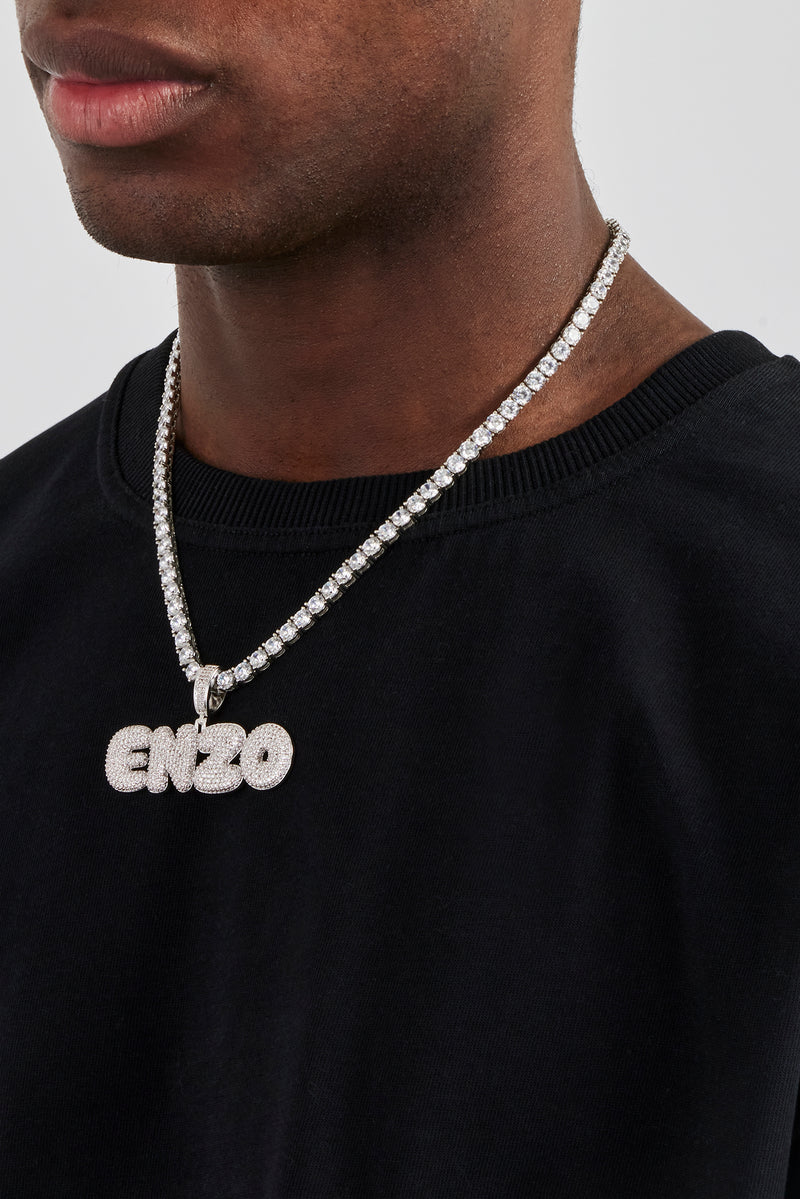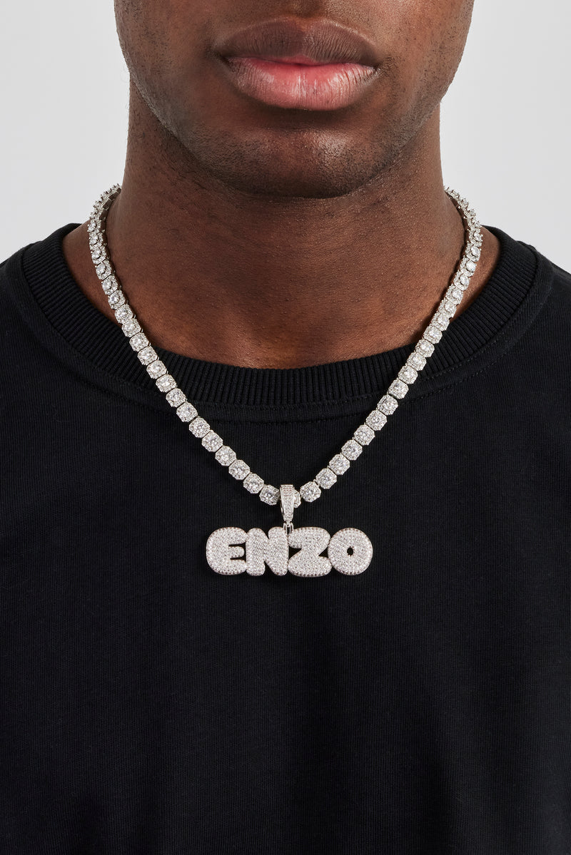 The iced bubble font letter pendant is the perfect addition to your ice collection. Choose up to 8 letters for a piece that is truly customised to you. Pair with either our 3mm rope chain, 5mm tennis chain or 7mm clustered tennis chain for the full look.