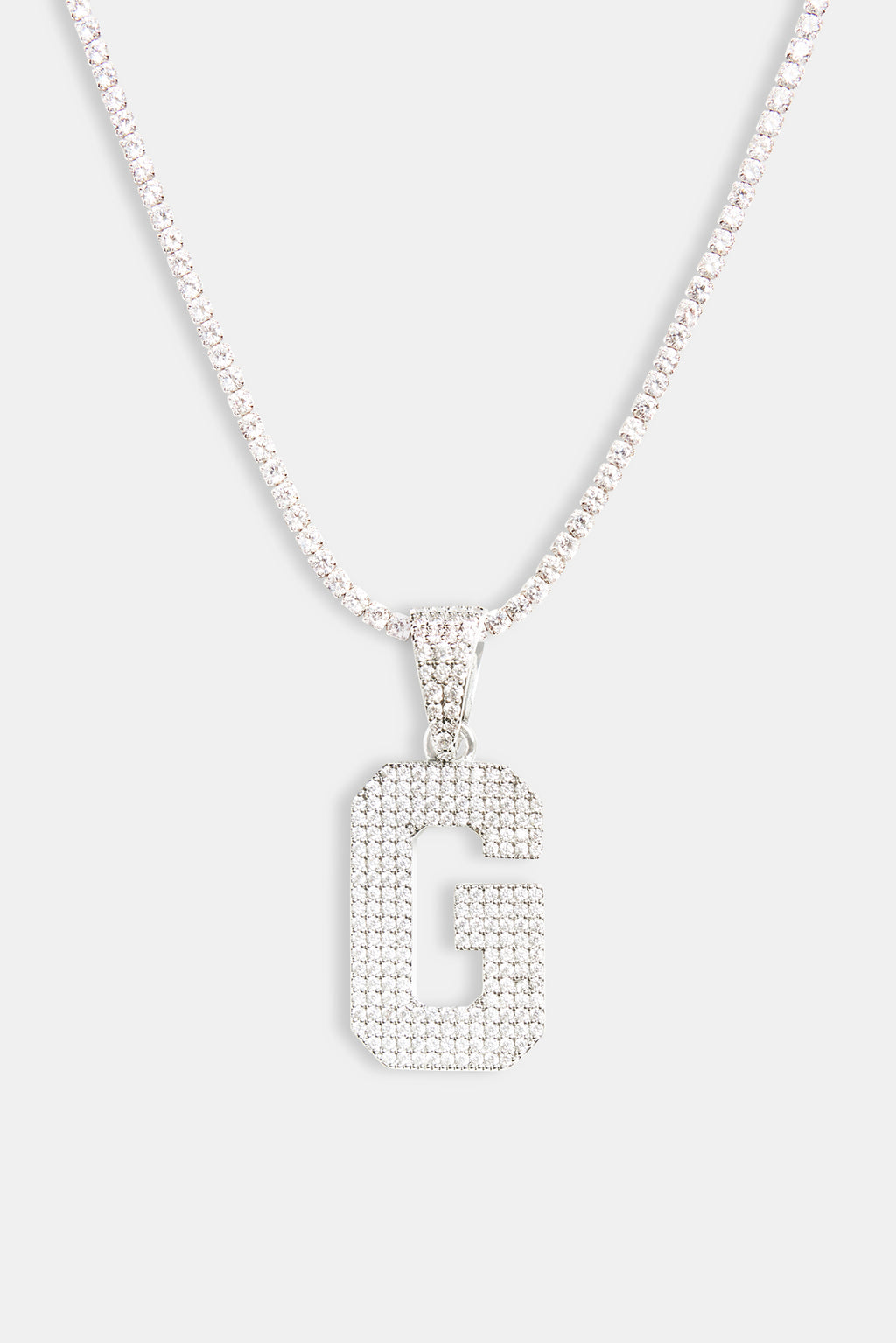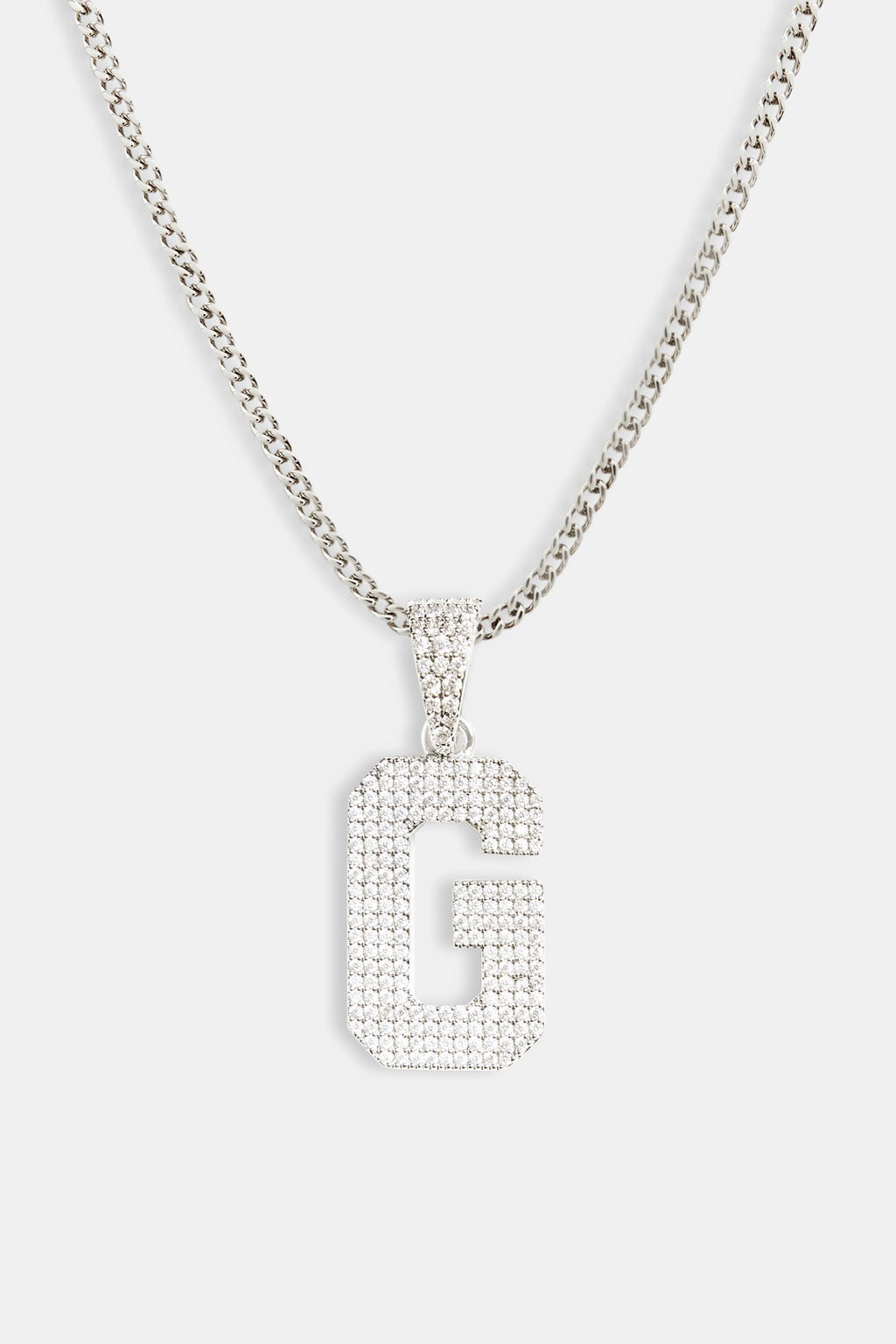 Iced Letter Motif Pendant in White and finished with Cubic Zirconia stones.