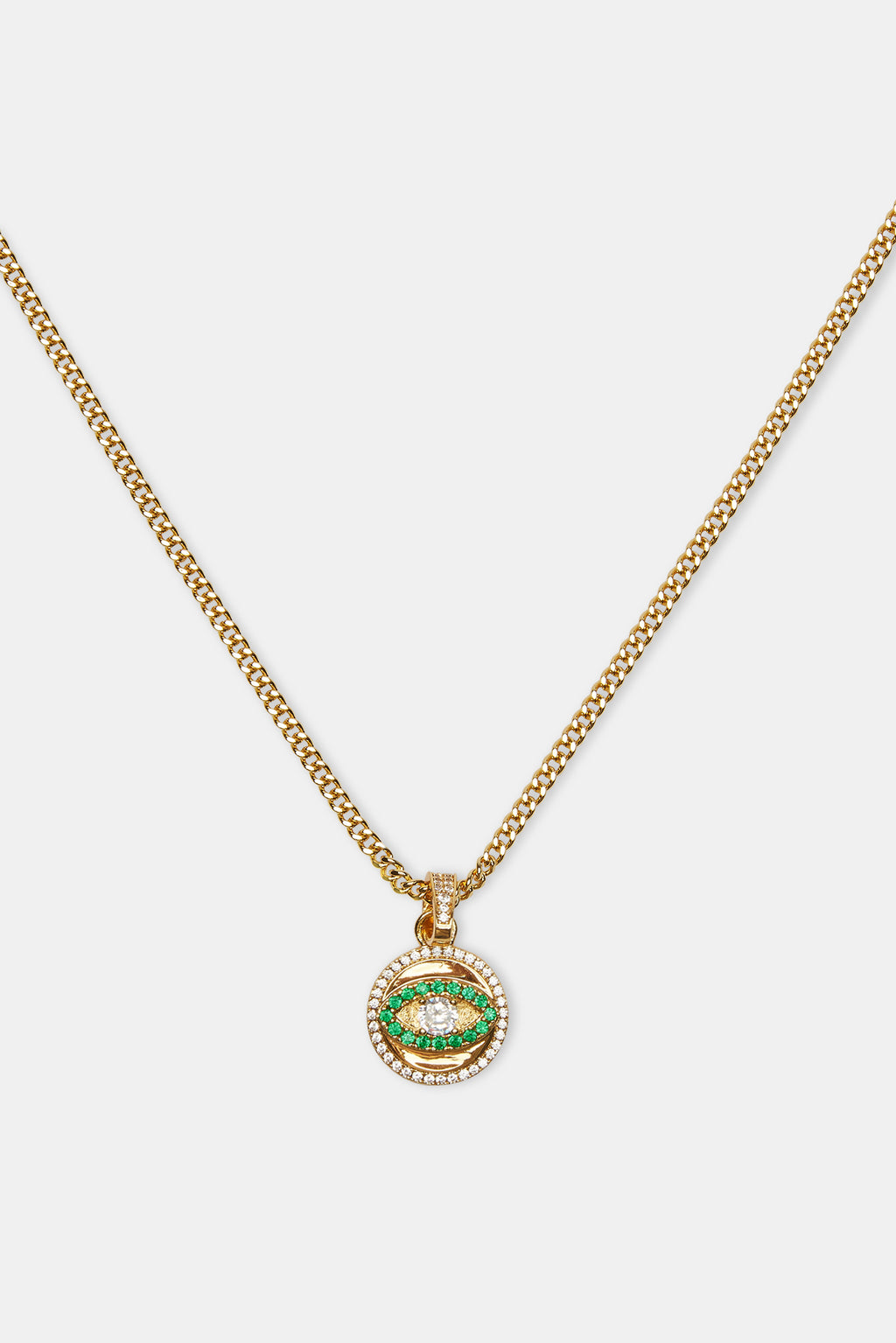 Increase aura with this evil eye disc necklace. Iced out to be worn alone or stacked with one of our iced chains.