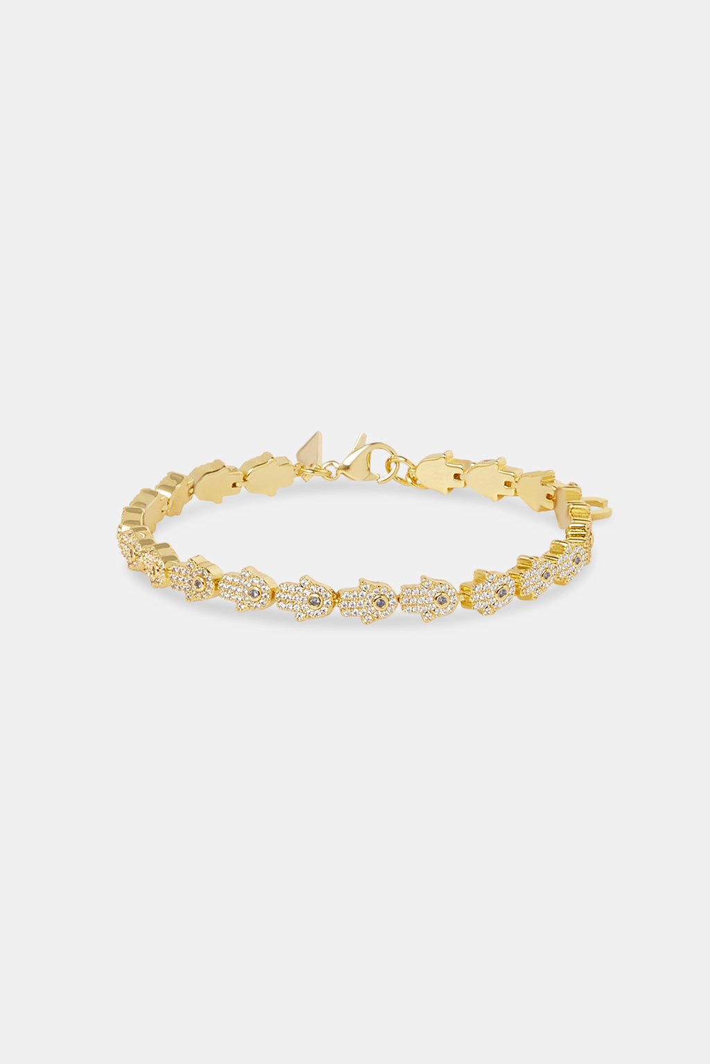 The Iced Hamsa Hand Bracelet brings spiritual vibes and full-on shine with a pavé Hamsa charm, all set on a clean, stackable link. Good energy never looked this fresh.