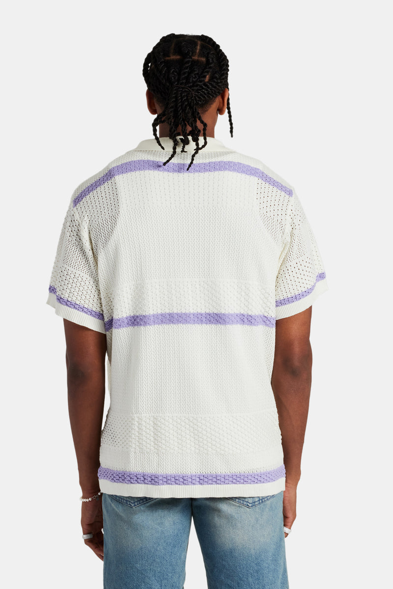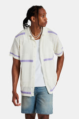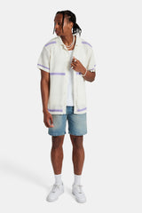 Cernucci knitted button front shirt, featuring contrast panels. The ultimate summer staple. Pair with a vest and our denim Bermuda shorts for the full look.